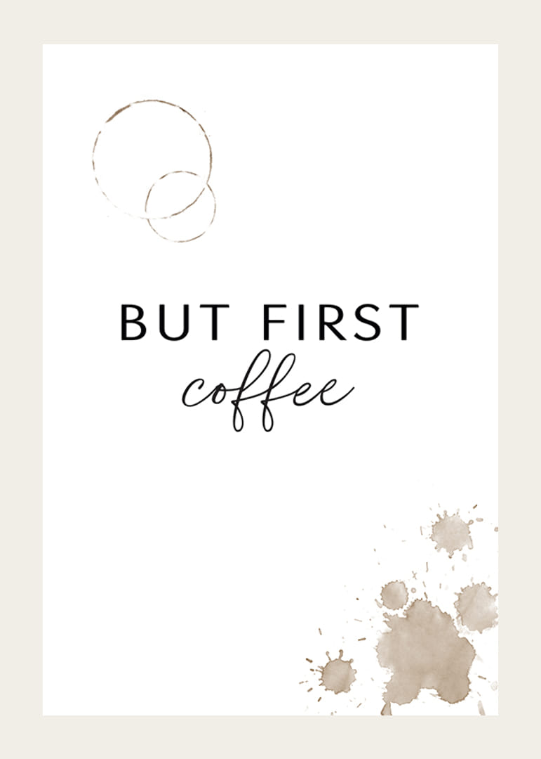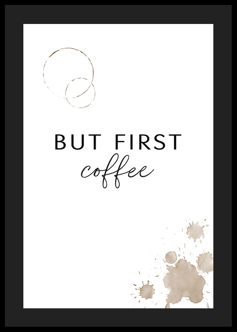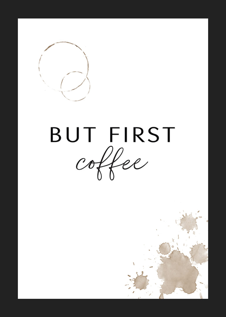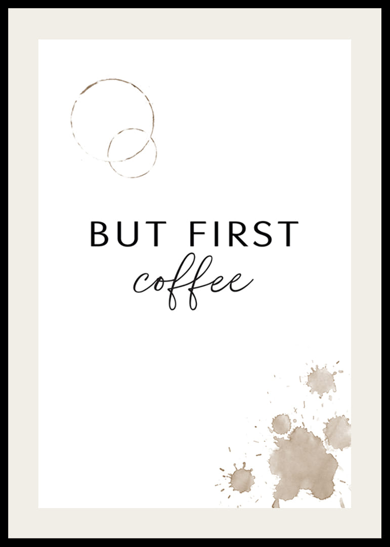 Fehér háttér előtt fekete szöveg, melyen nagybetűkkel és stílussal íródott a "But First Coffee" (But First Coffee). Fent két gyűrű alakú kávéfolt, jobb alul pedig több barnás-bézs kávéfröccsenés látható. Ez a poszter a reggeli rutin hangulatát ragadja meg, és tökéletes egy konyhába vagy étkezőbe, hogy személyes és nyugodt légkört teremtsen.