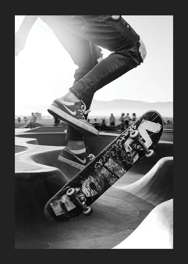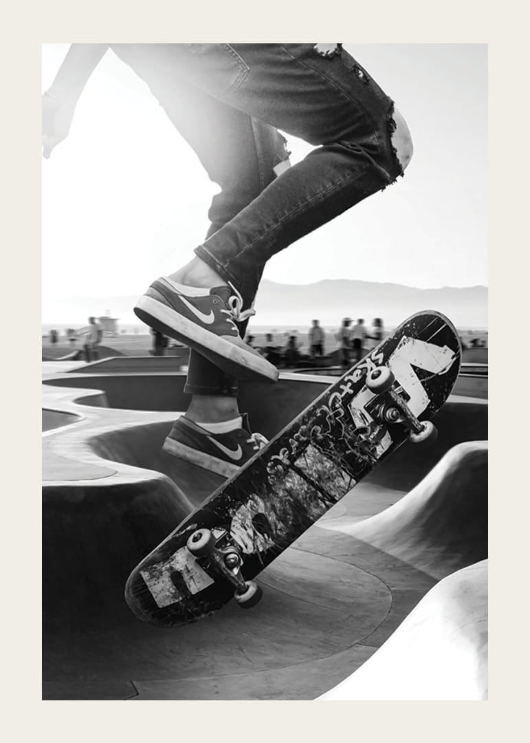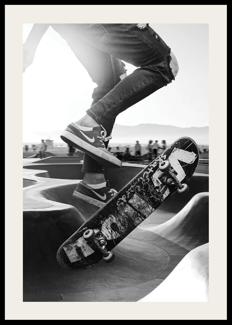 Egy pillanat egy betonrámpán szárnyaló gördeszkást örökít meg, akinek szakadt farmerja és kopott tornacipője tisztán látható. A motívum fekete-fehér tónusai kiemelik a gördeszkás, a deszka és a napsütötte gördeszkapark közötti kontrasztot. A poszter városi hangulatot kölcsönöz, és a tinédzserszobáktól a modern nappalikig mindenhez illik.