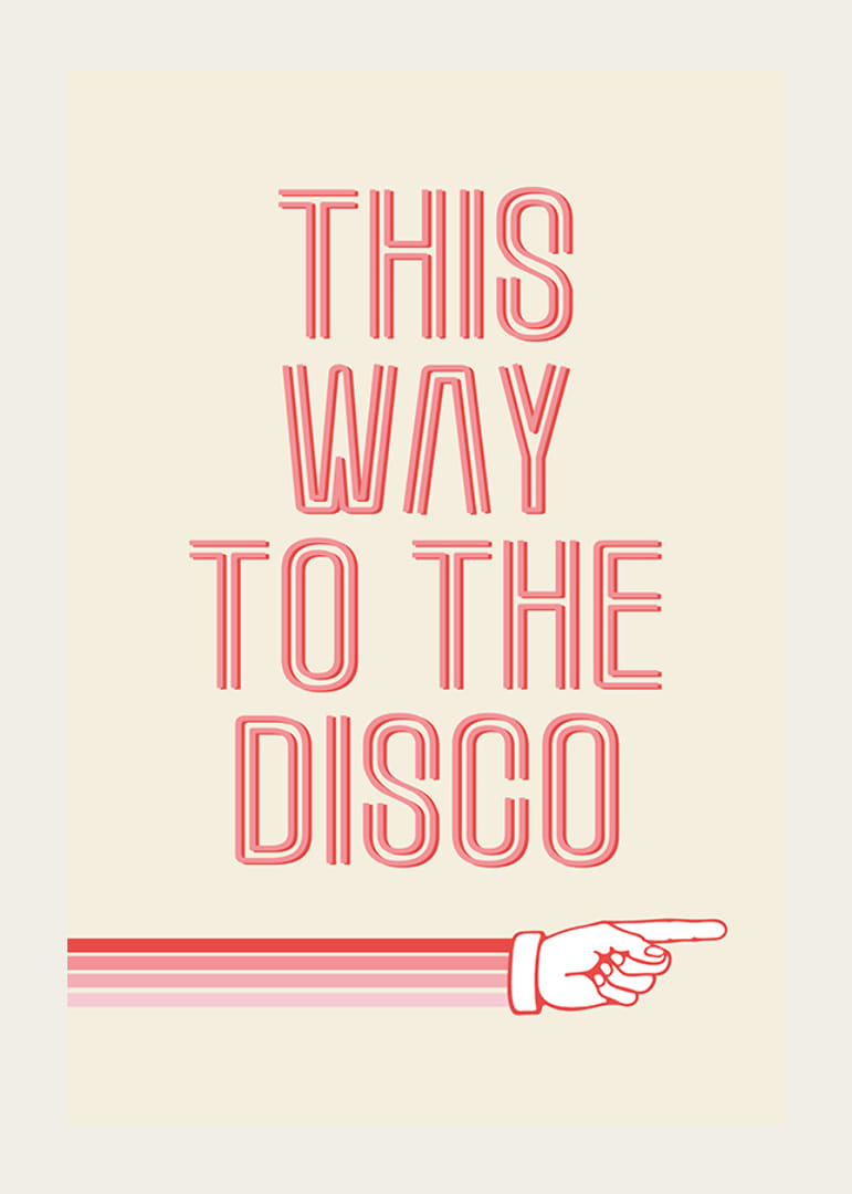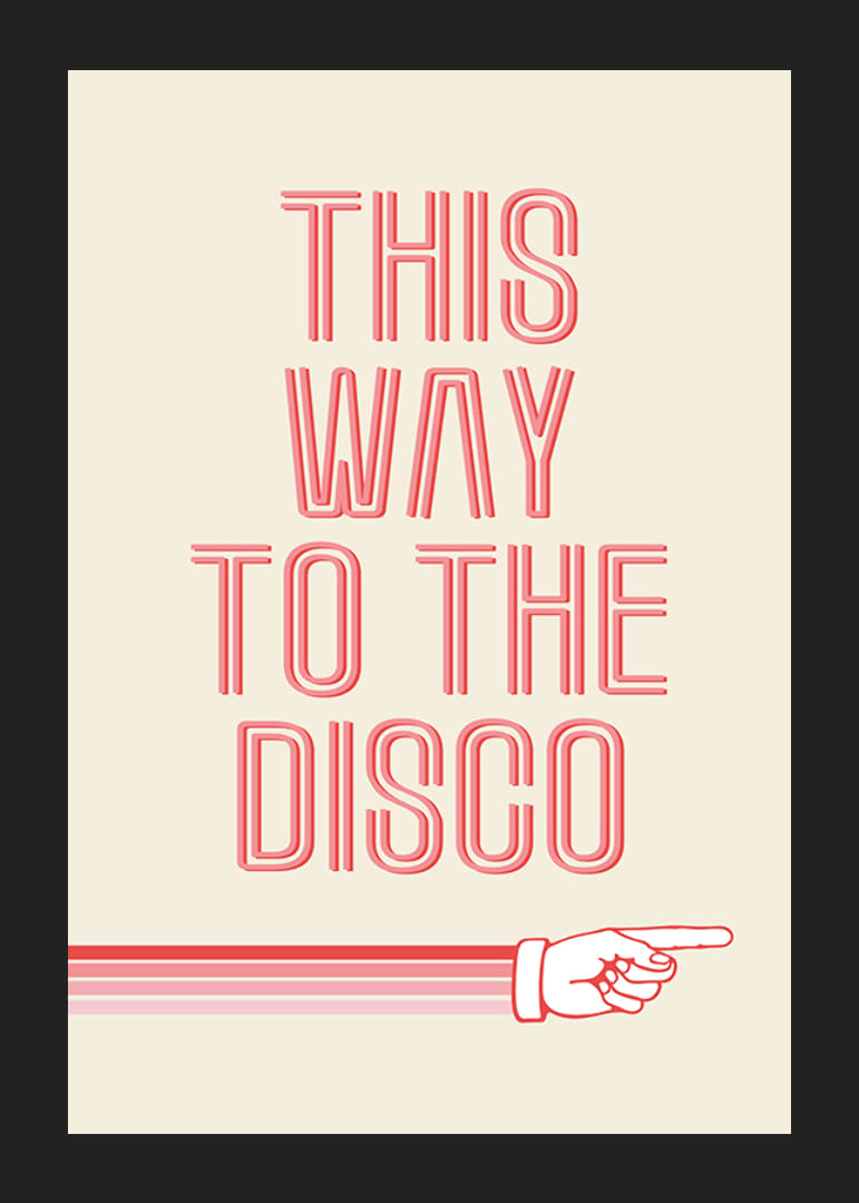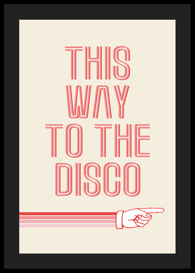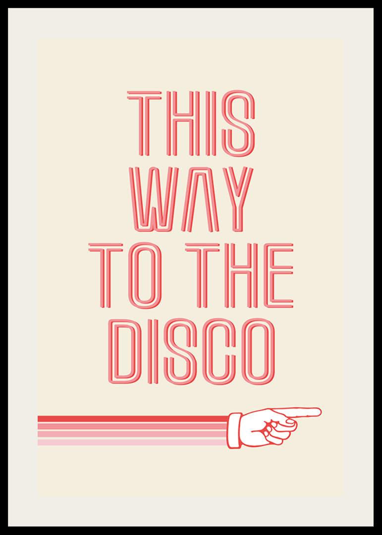 Grafikai terv nagy rózsaszín szöveggel, ahol a „This way to the disco” felirat emelkedik ki világos bézs háttér előtt. Alul egy stilizált, jobbra mutató kéz látható, alatta három rózsaszín vonallal. A retró ihletésű poszter játékos belsőépítészeti részletként illik mind a folyosóra, mind a nappaliba.