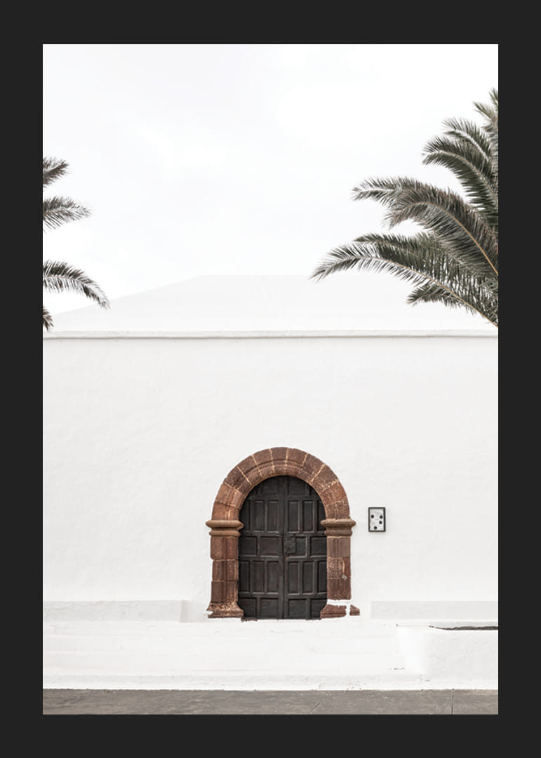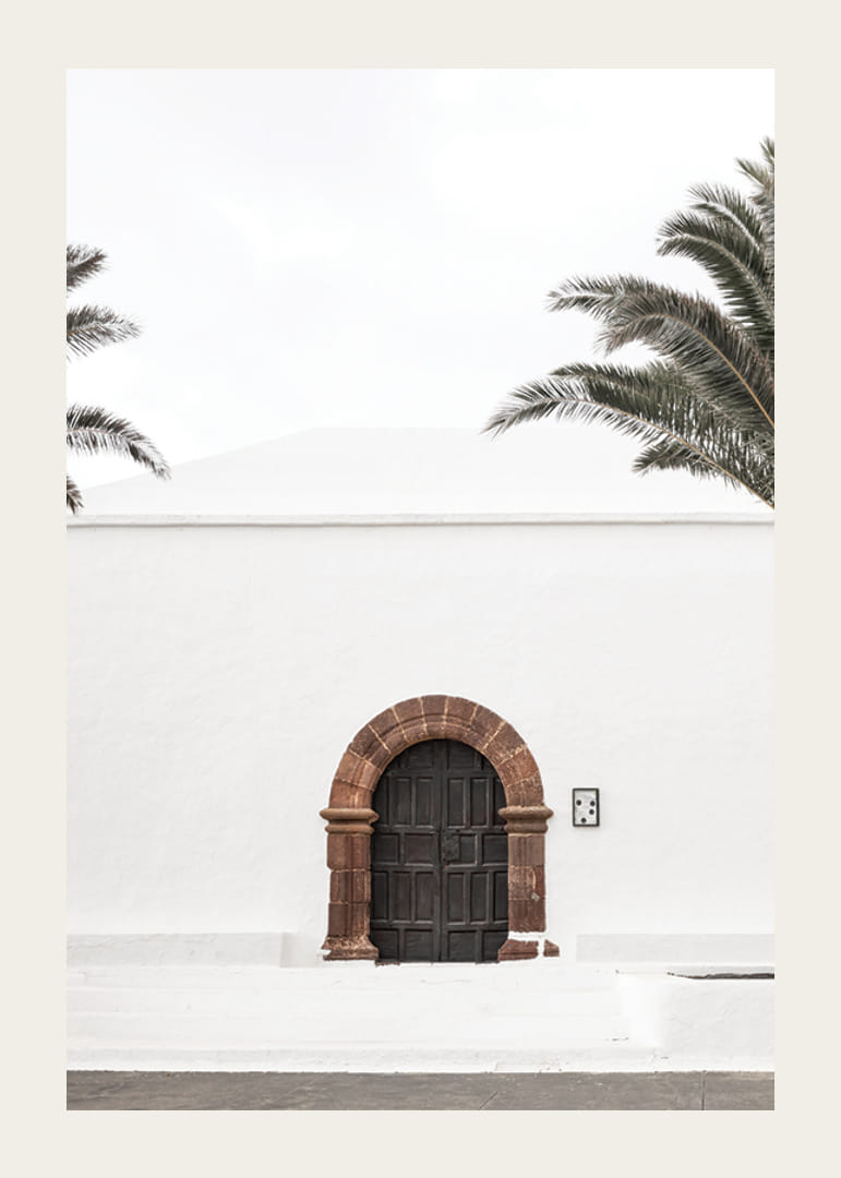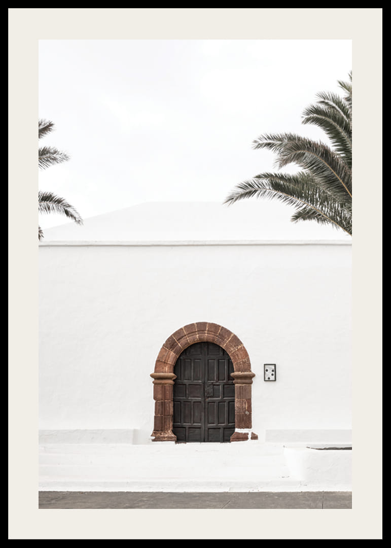 A poszter motívuma egy sötétbarna faajtó rusztikus kőívvel, amely kontrasztot alkot a fehér, vakolt téglafallal mediterrán környezetben. A világos égbolt hátterében két pálmafa keretezi a képet, letisztult és világos benyomást keltve. Ez a poszter jól illik mind a folyosóra, mind a nappaliba.