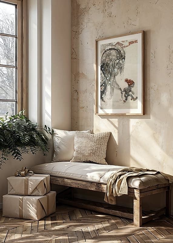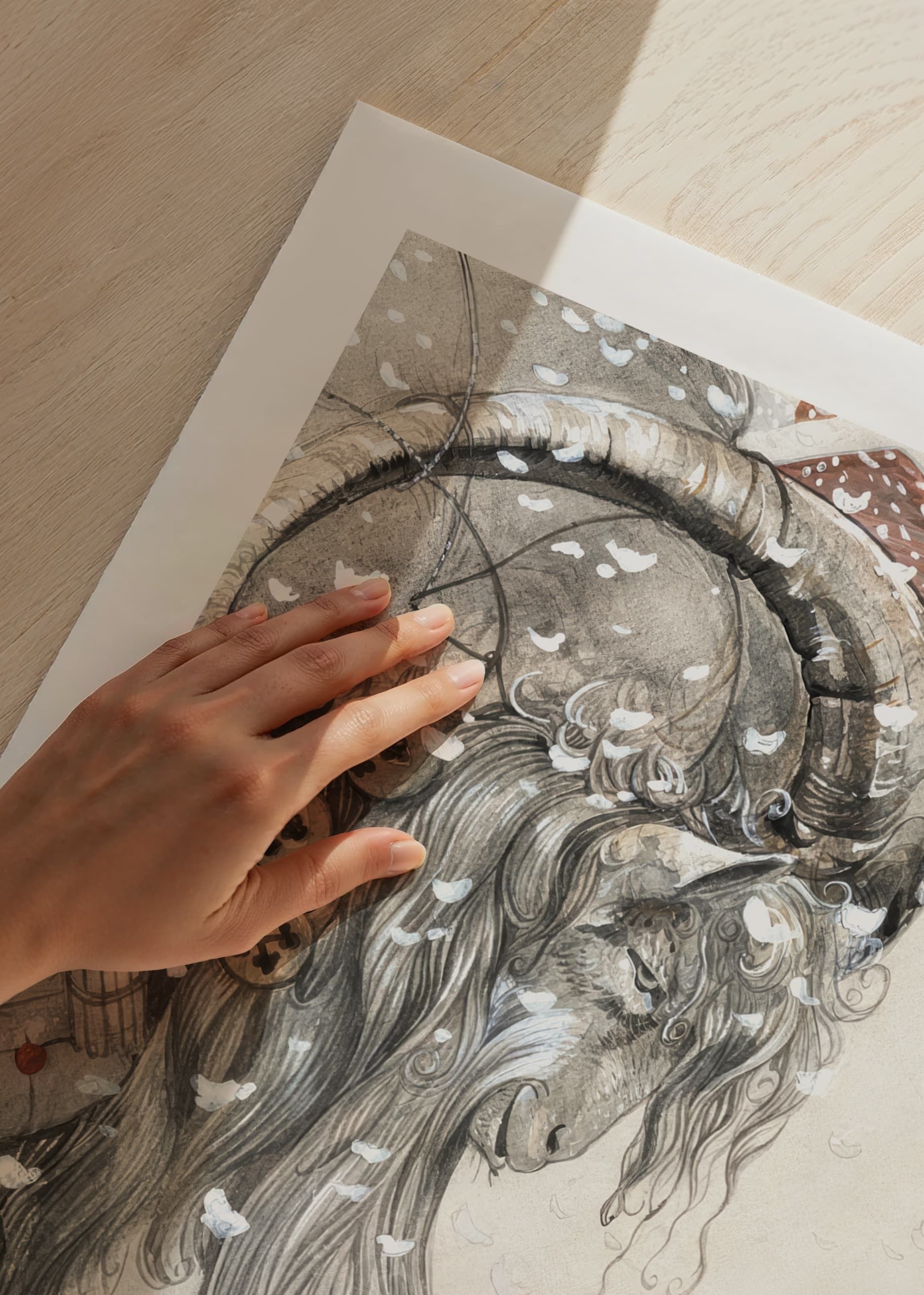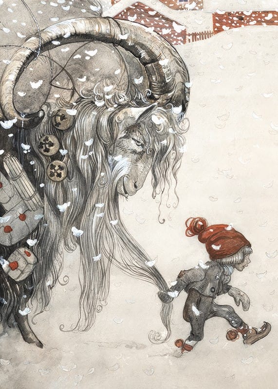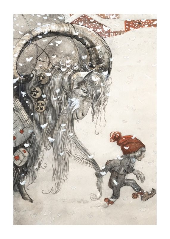 A motívum egy nagy, hosszú szarvú karácsonyi kecskét ábrázol, mellette egy piros sapkás gyereket. Hópelyhek hullanak mindkettőre, a háttérben pedig egy kunyhó látható. Ez a John Bauer által készített, 1911-es, részletesen kidolgozott plakát karácsonyi hangulatot áraszt, és a téli hónapokban hangulatos eleme lesz az otthonnak. A festmény a "The Christmas Goat: A Christmas Magazine for Big and Small Children" című kiadvány borítóképe volt.
