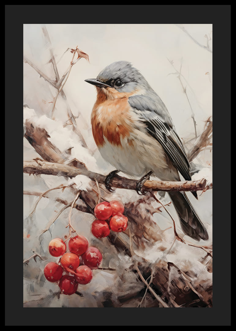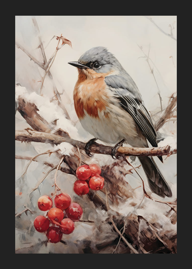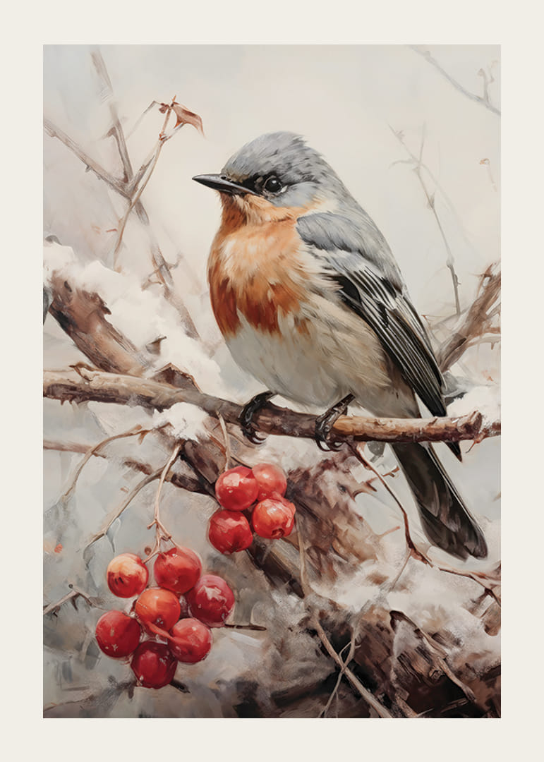 Egy szürkéskék fejű és meleg narancssárga-barna mellmintás kismadár ül egy deres ágon, hó és piros bogyós gyümölcsök fürtjei veszik körül. A visszafogott téli tónusokat a bogyók élénk színei és a madár részletes tollazata töri meg. Ez a poszter természetközeli hangulatot és szezonális jelleget kölcsönöz otthonodnak egész évben.