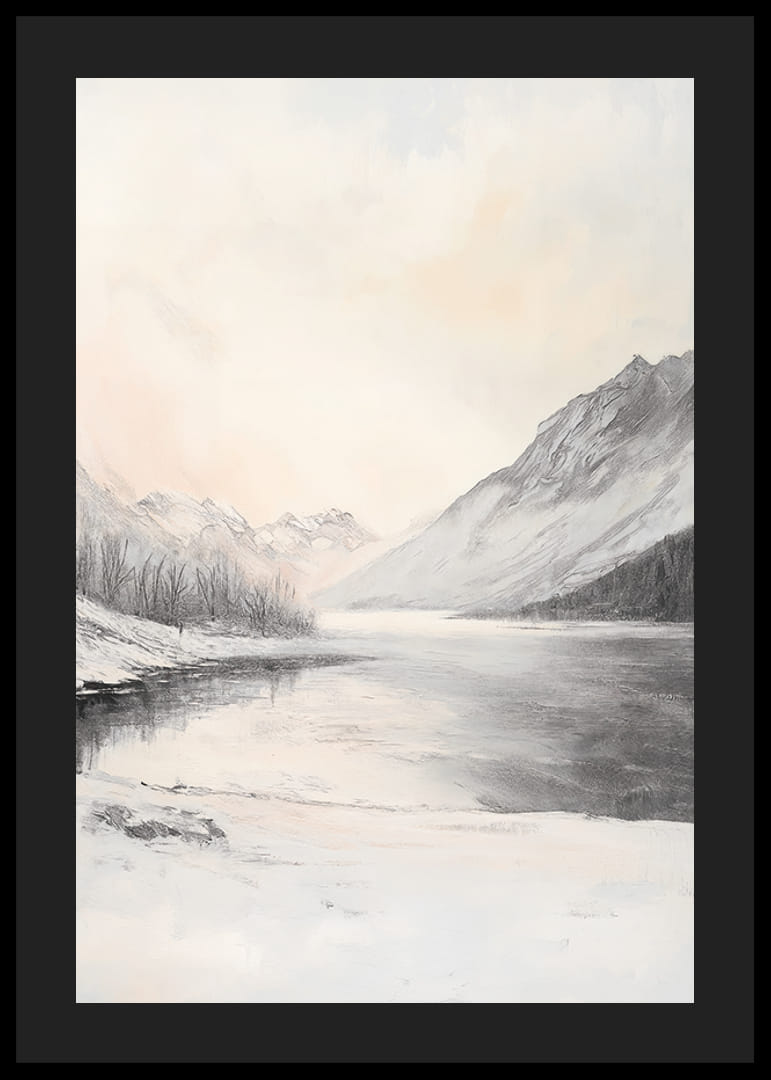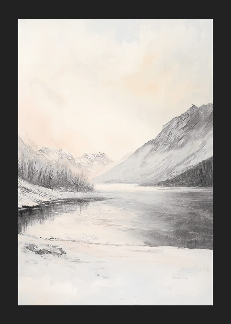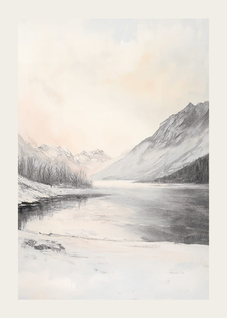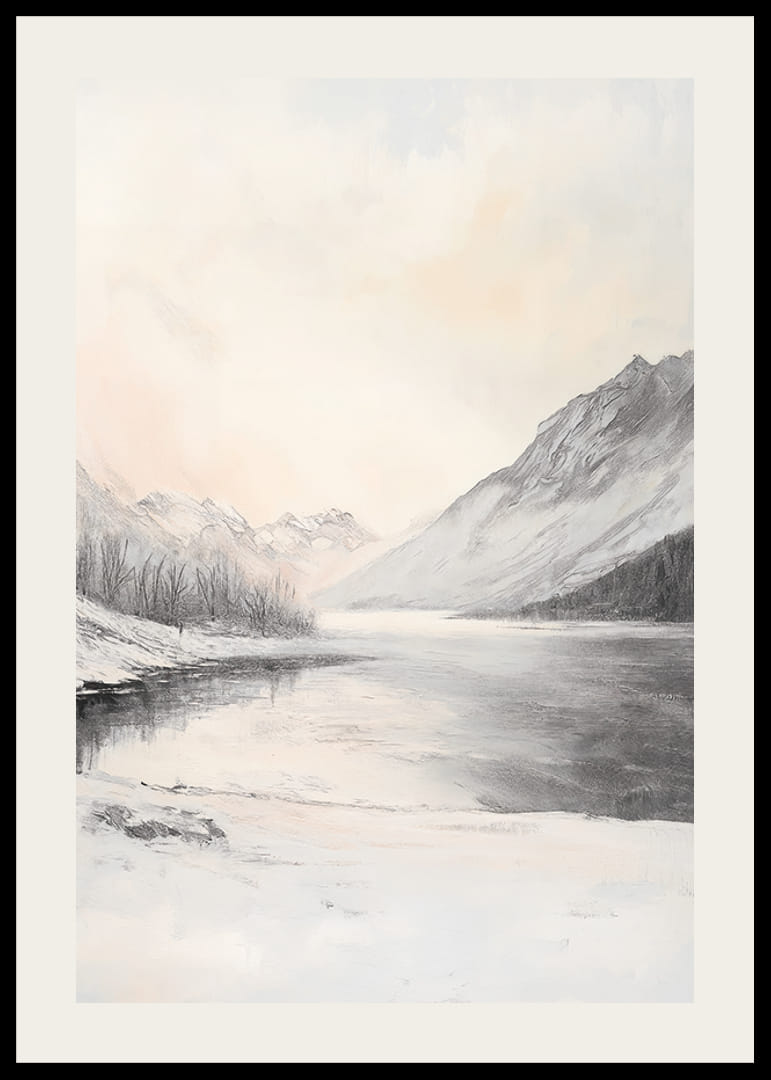 A motívum egy téli tájat ábrázol, hófödte hegyekkel, amelyek egy befagyott tavat vesznek körül. A part mentén fák sziluettjei állnak, míg az ég világos, finom szürke és halvány barackszínű árnyalatokkal. A visszafogott színvilág és a nyugodt kompozíció révén ez a poszter könnyen illeszthető a legkülönfélébb otthoni környezetekbe.