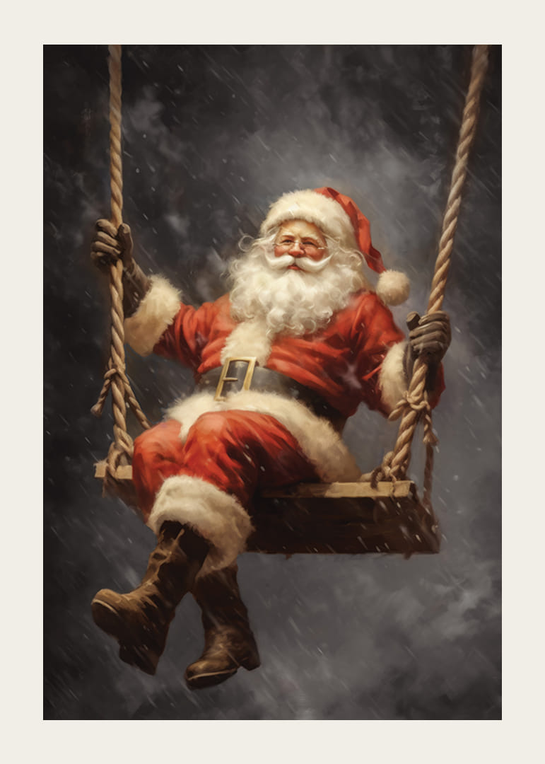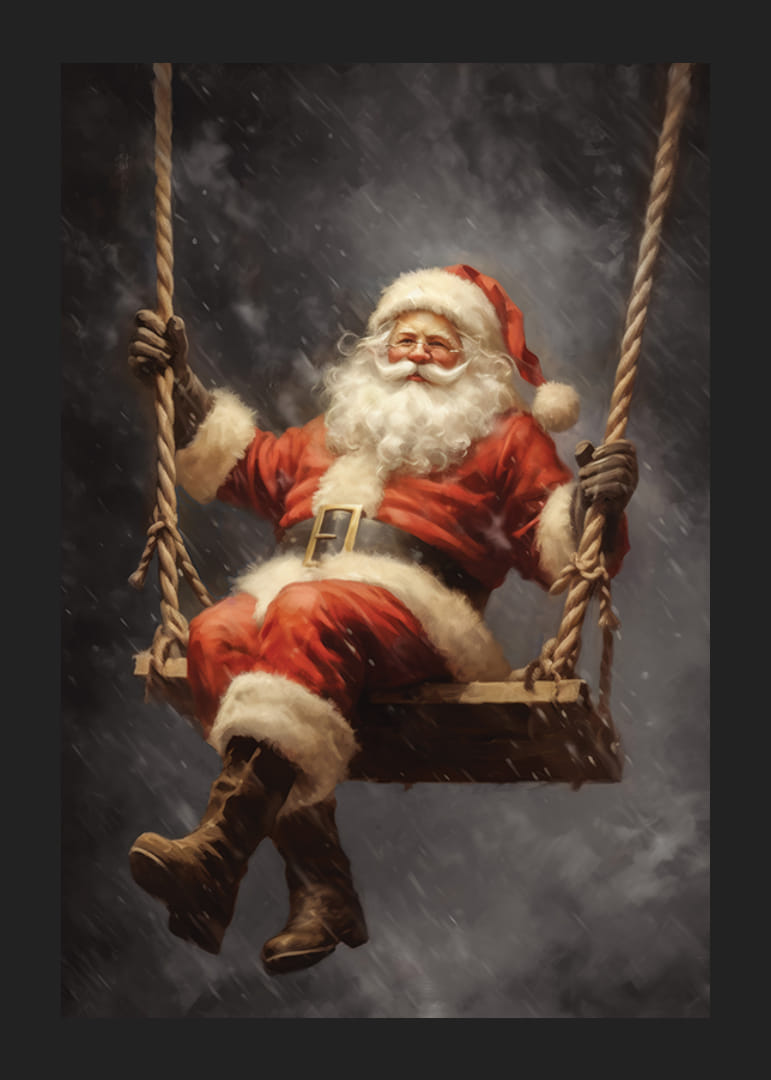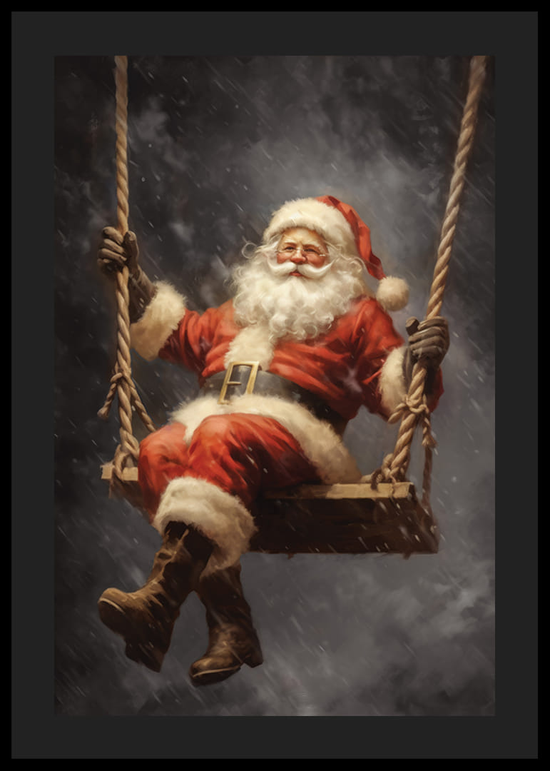 A Mikulás ellazultan ül egy fa hintán, kavargó hóval körülvéve, sötét, enyhén elmosódott háttér előtt. A Mikulás jelmez élénk piros és fehér színeit kiemeli a lágy fény. Klasszikus karácsonyi hangulatú poszter, amely melegséget és hangulatot visz a nappaliba és a folyosóra egyaránt a karácsonyi szezonban.