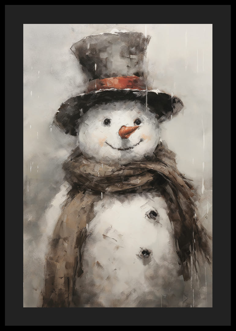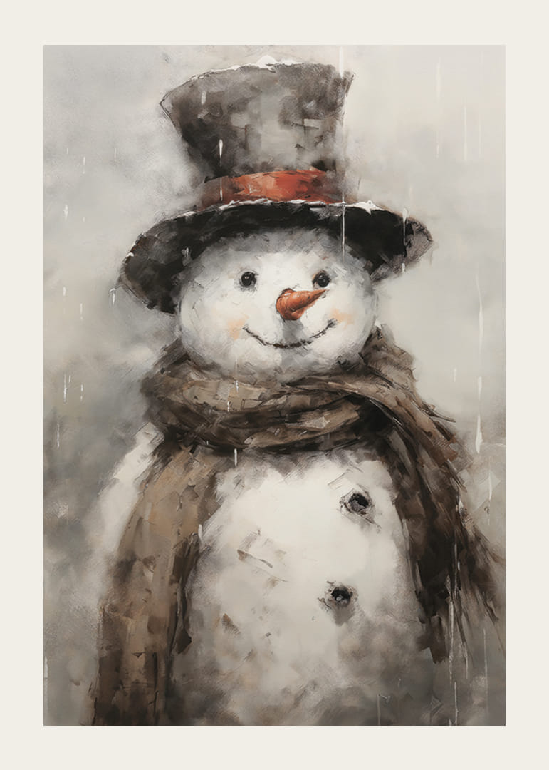 Egy széles cilinderes és barna sálas hóember áll világosszürke háttér előtt. A motívumot lágy ecsetvonások és tompa fehér, barna és fekete színek jellemzik, amelyek klasszikus téli hangulatot kölcsönöznek. A barátságos hóember téli hangulatot kölcsönöz a poszternek, és jól mutat előszobában, gyerekszobában vagy nappaliban.