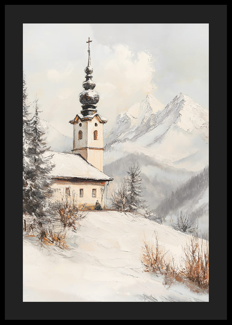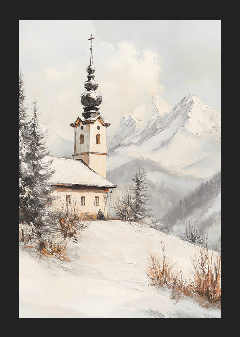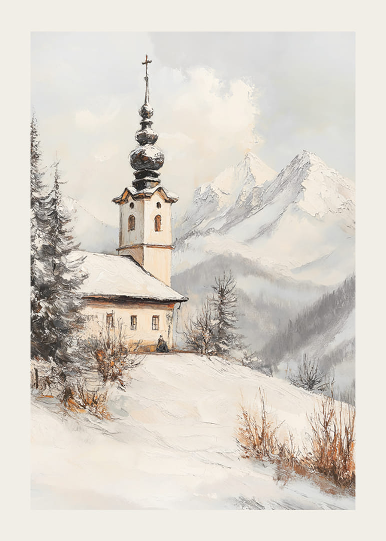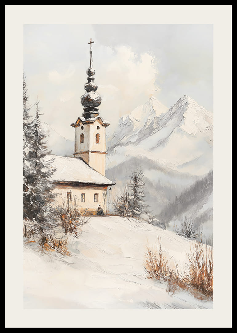 Egy jellegzetes tornyú templom áll egy hófödte dombon, fenyőfák és téliesen ragyogó bokrok ölelésében. A háttérben drámai, hófödte hegycsúcsok látszanak a szürkésfehér ég alatt. A kompozíció nyugalma olyan kifejezőerőt kölcsönöz ennek a poszternek, amely nappalikba és előszobákba egyaránt illik.