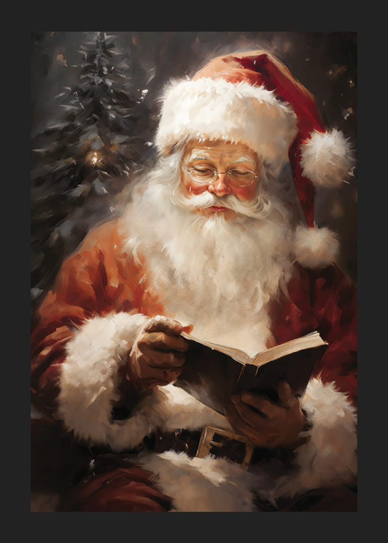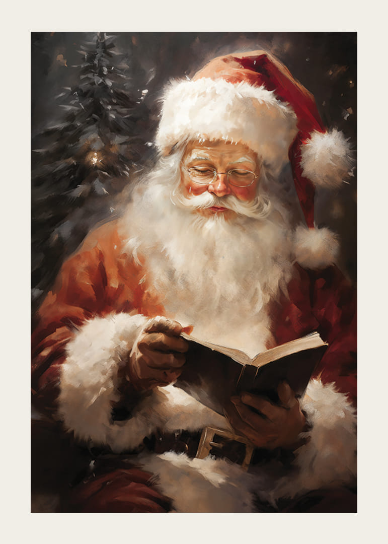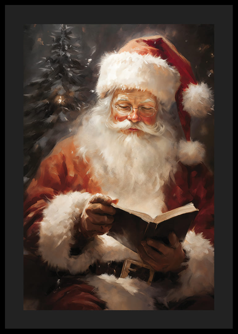 A festmény egy klasszikus, fehér szakállú és piros sapkás Mikulást ábrázol, amint ül és egy könyvből olvas. A háttérben egy zöld fenyőfa magasodik, amelyet meleg, lágy fény világít meg, hívogató hangulatot teremtve. Ez a poszter tökéletes karácsonyi otthonba, és a hagyomány és a gondoskodás érzetét kelti.
