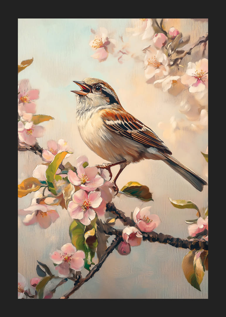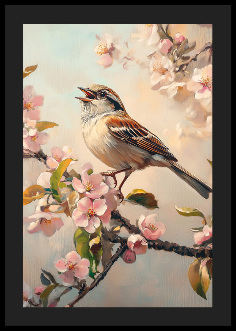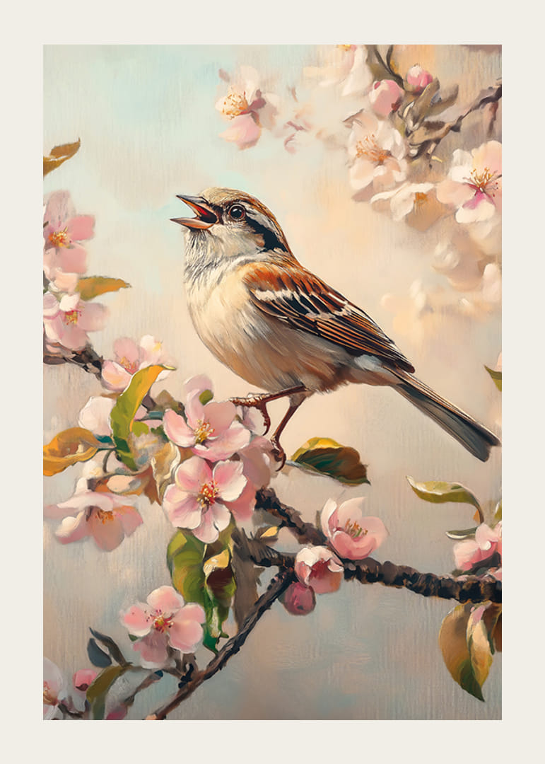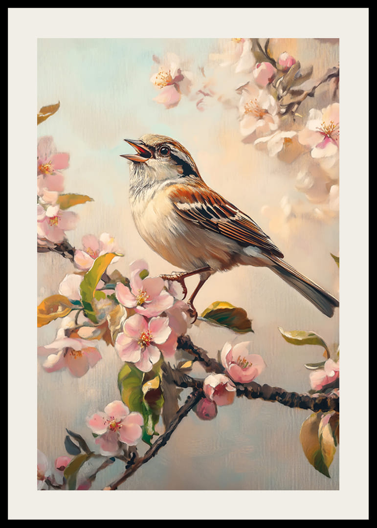 Egy barna és szürke tollú madár ül énekelve egy ágon, világos rózsaszín tavaszi virágok és friss zöld levelek veszik körül. A háttér tompa kék és bézs árnyalatokban pompázik, ami lágy keretet ad a motívumnak. A kifejező poszter tökéletes egy világos és tavaszi ihletésű hangulat megteremtéséhez az otthonban.