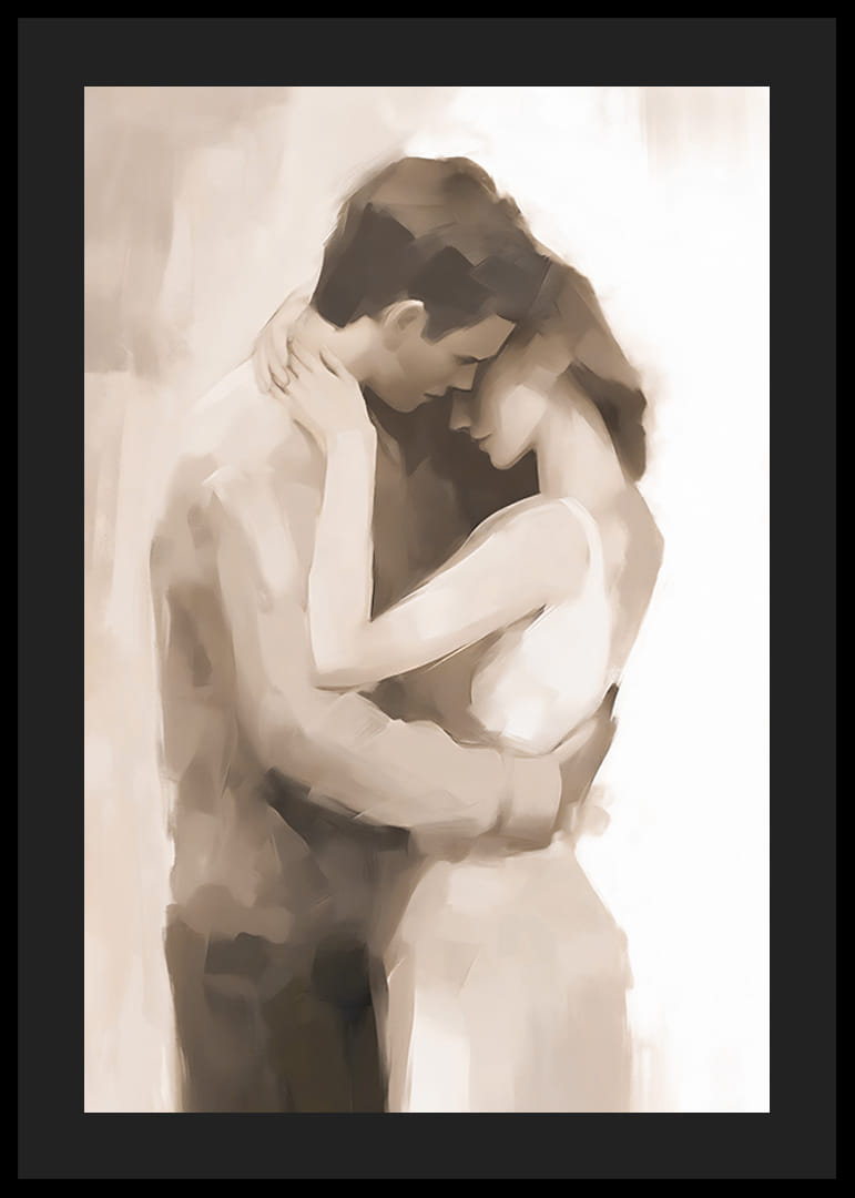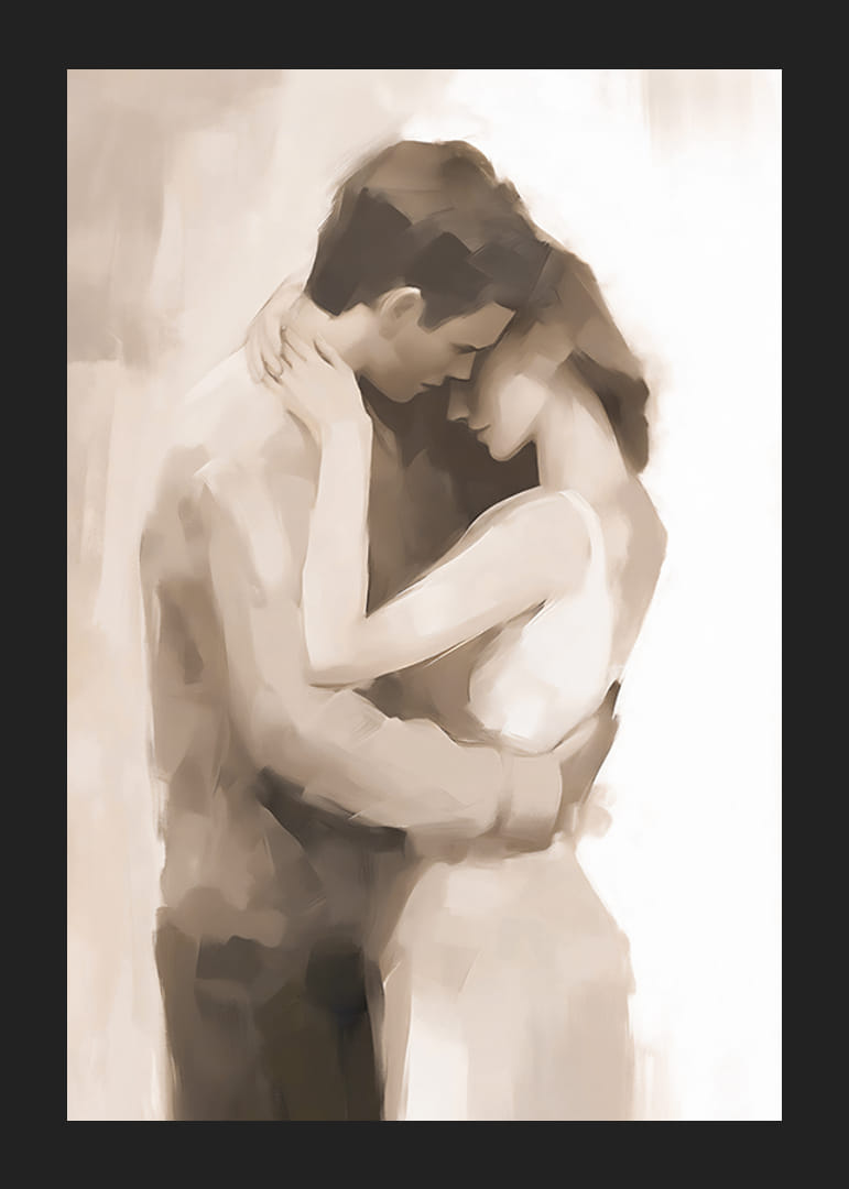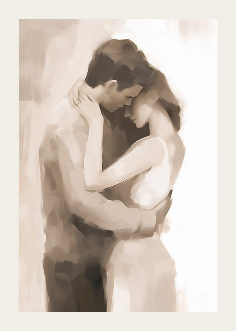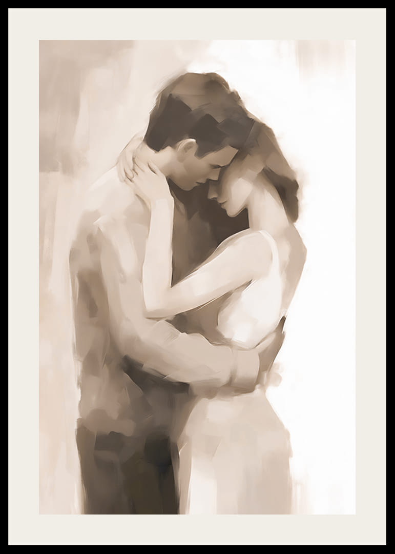A motívumon lágyan festett, egymást ölelő pár sziluettjei láthatók, meleg bézs és barna árnyalatokban kidolgozva. Az absztrakt ecsetvonások hosszan tartó érzetet és finom mozgást keltenek. Díszítsd hálószobádat vagy nappalidat ezzel a poszterrel, hogy stílusos és érzelmes fali dekoráció legyen.