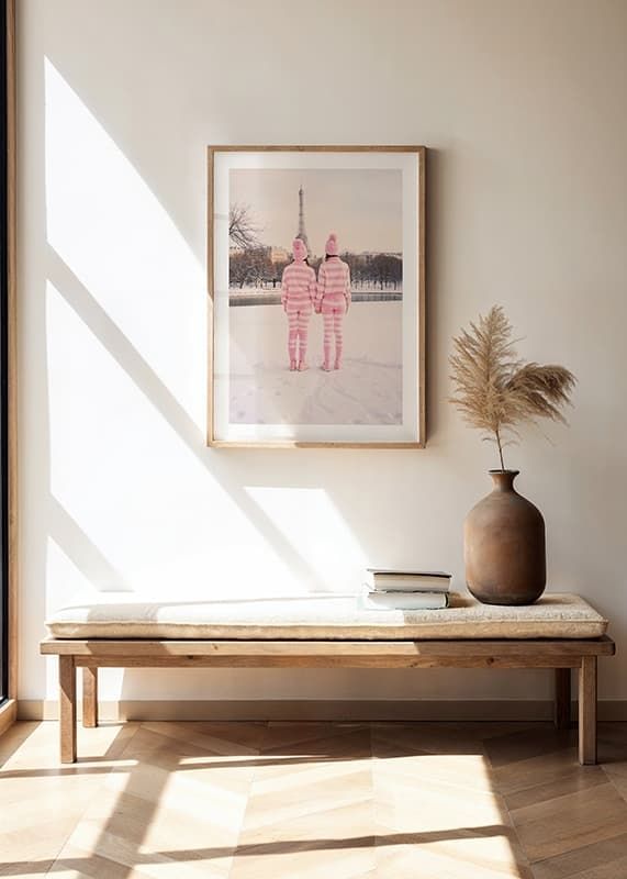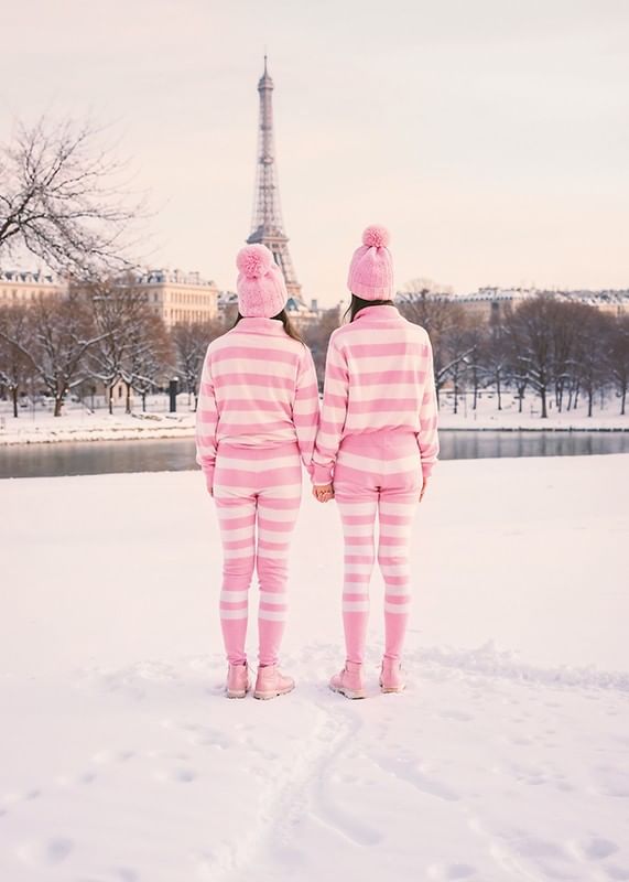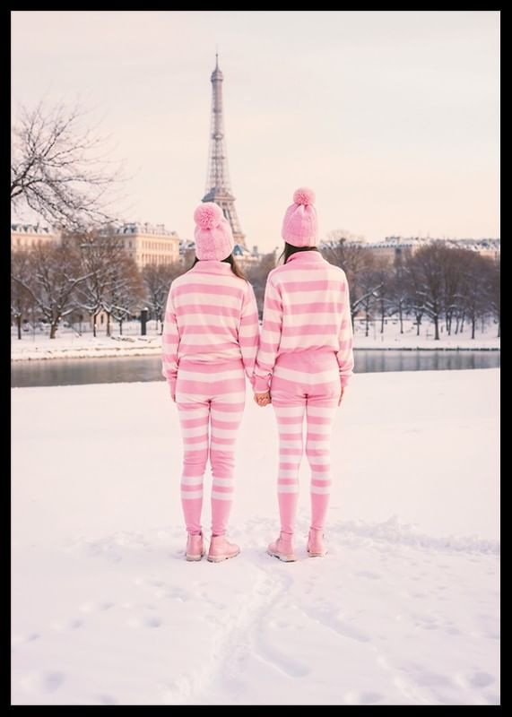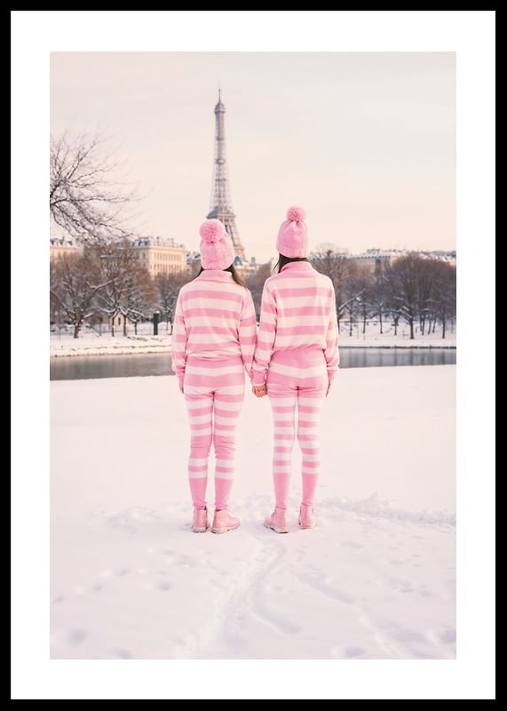 Poszter, melyen két lány látható egyforma rózsaszín csíkos pizsamában és kalapban, amint kéz a kézben állnak a hóban, háttal a kamerának. Az Eiffel-torony a háttérben magasodik egy téli fehér város és lágy pasztellfény hátterében, játékos és meleg hangulatot teremtve otthonodban.