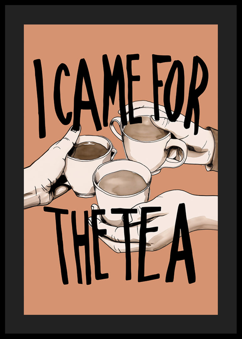 Poszter három kézen tartó forró teát tartó posztert ábrázoló poszter, amelyen a „I CAME FOR THE TEA” felirat látható nagy, fekete betűkkel. A színvilág egyszerű, meleg, monokróm terrakotta háttérrel, kontrasztban a szürke tónusú rézekkel.