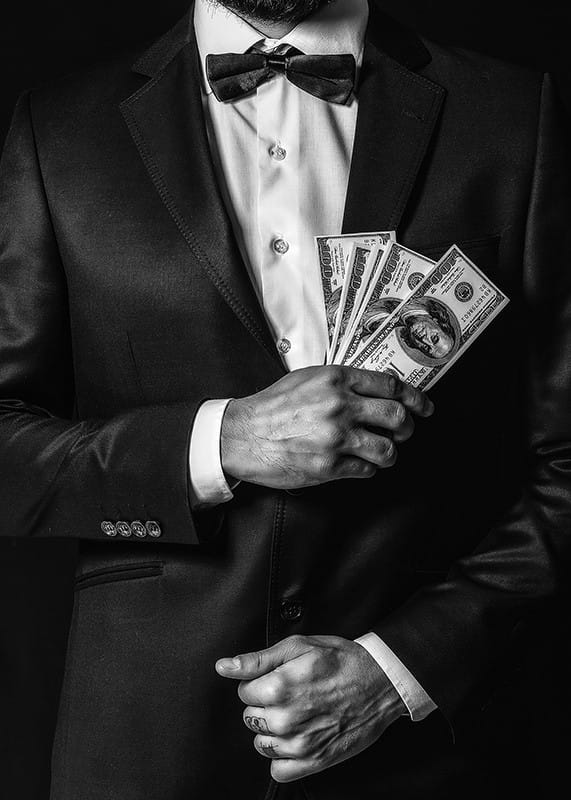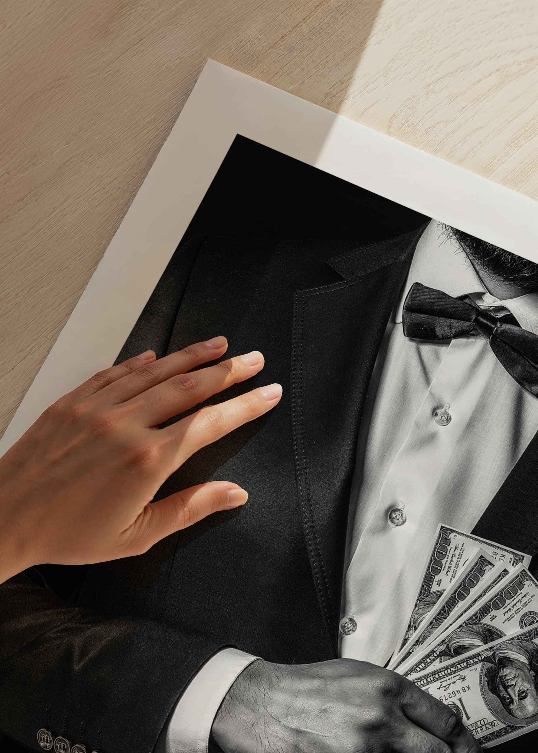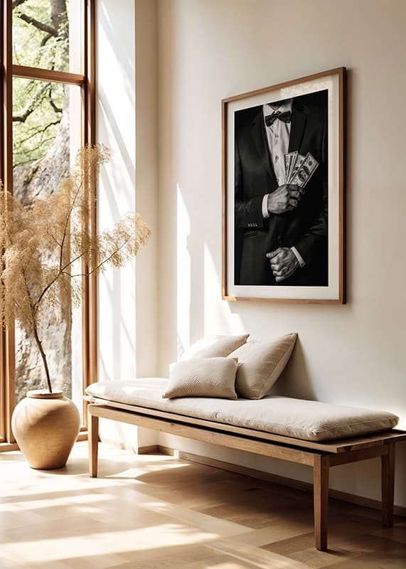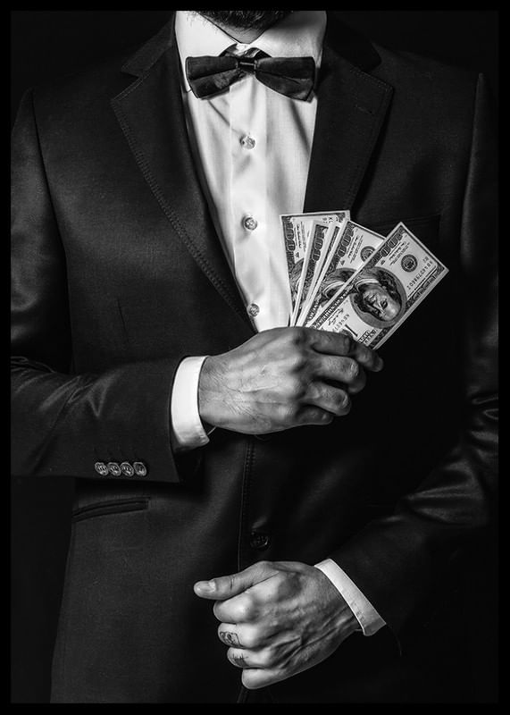 Poszter a Photo Art kategóriából egy fényképpel, amely egy kifinomult, öltönyös férfit örökít meg, magabiztosan és stílusosan bankjegykötegeket tartva. Az erős kontraszt kiemeli mind az öltöny, mind a pénz részleteit, sikert és tekintélyt sugárzó imázst alkotva.