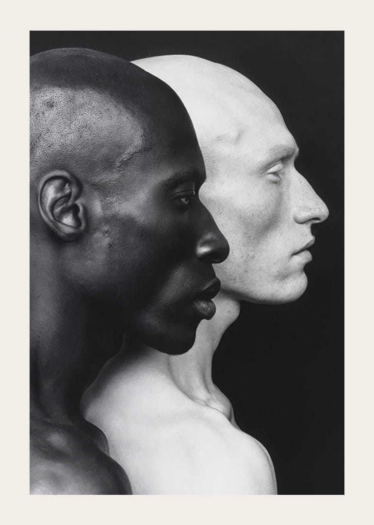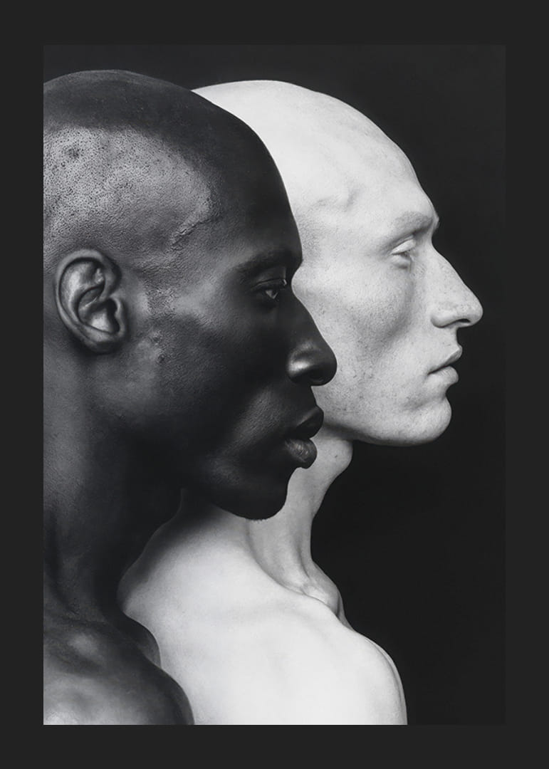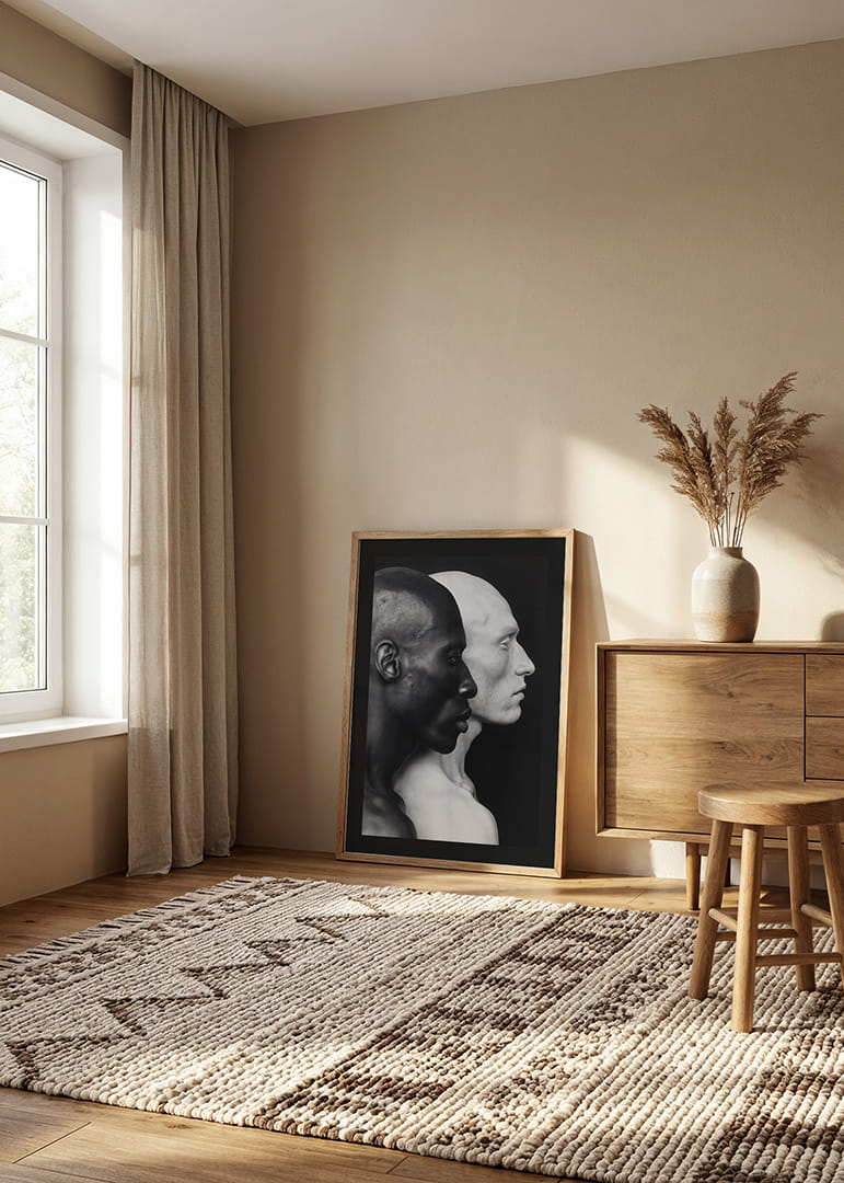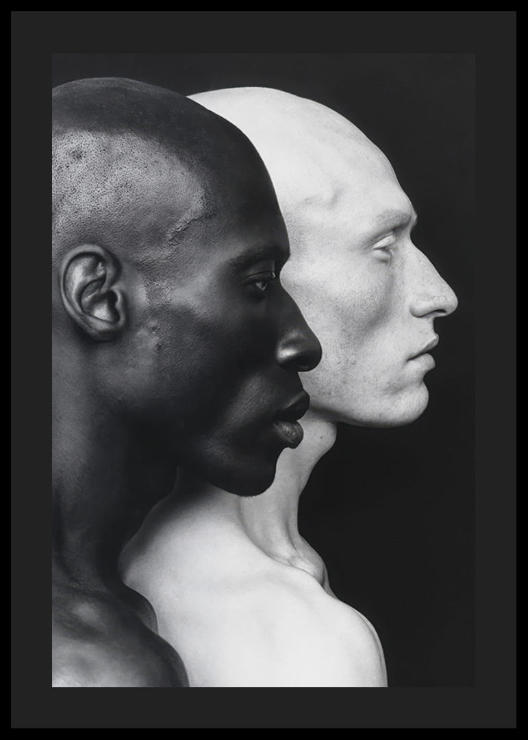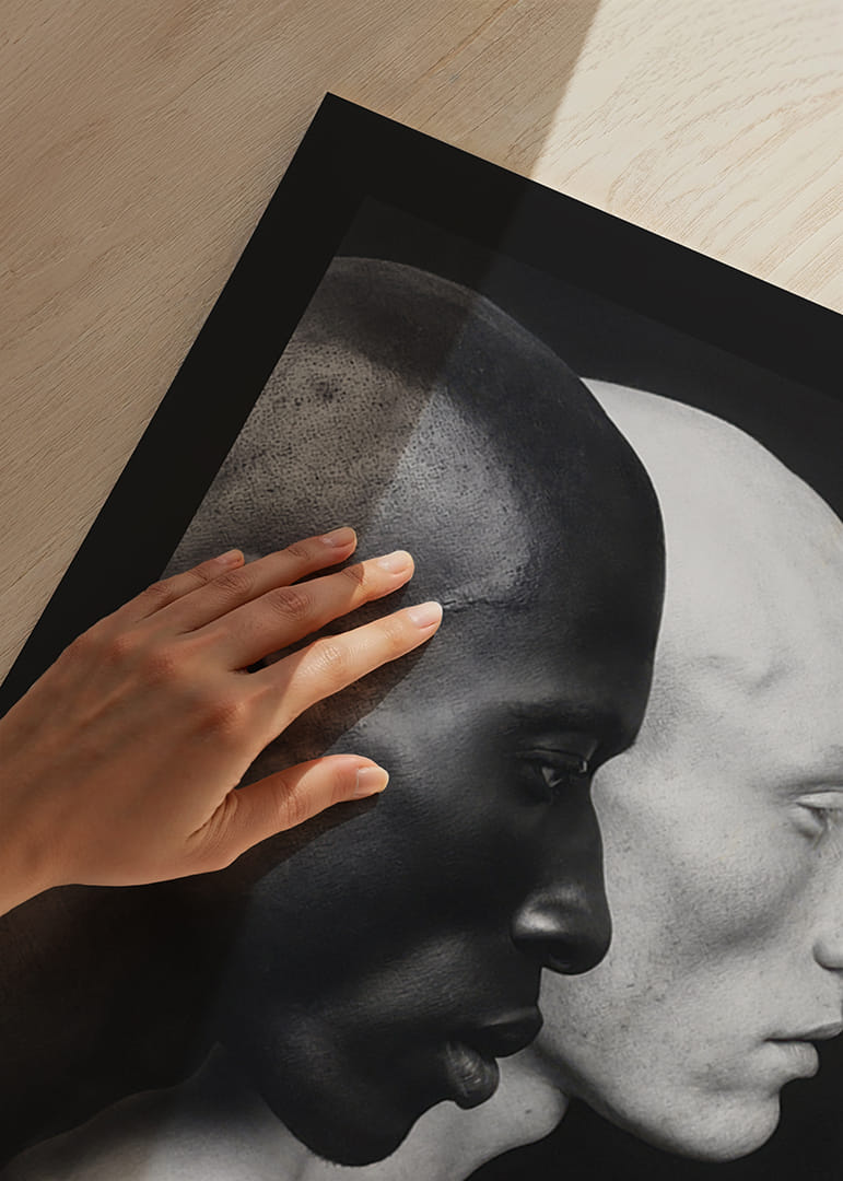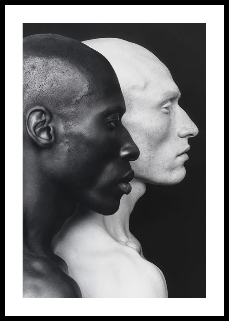 Ez a plakát erőteljes és elgondolkodtató képet mutat két férfi arcról, egy sötét bőrű és egy világos bőrű, egymásnak háttal. A bőrszínük közötti éles kontraszt az emberiség kettősségét és sokszínűségét szimbolizálja. A kép az egység és a különbözőség témáját járja körül, miközben egymás mellett állva megőrzi egyedi identitását. A minimalista dizájn és a fekete-fehér színséma kiemeli az arcuk részleteit, és erős vizuális hatást kelt.