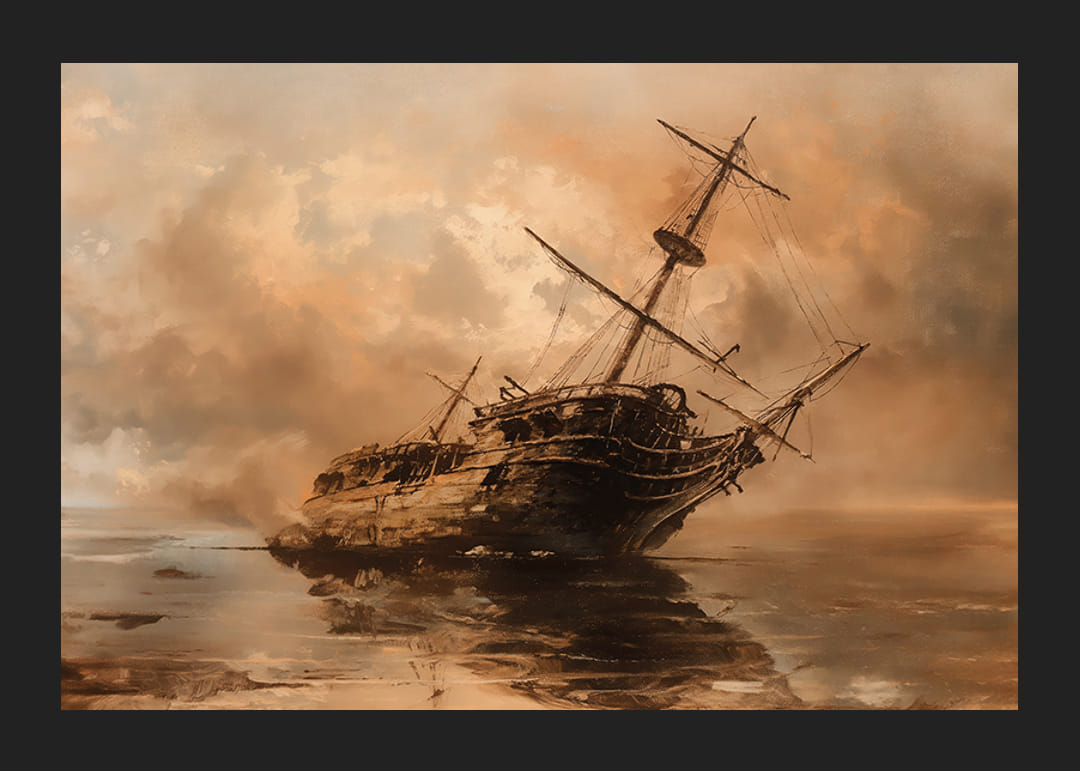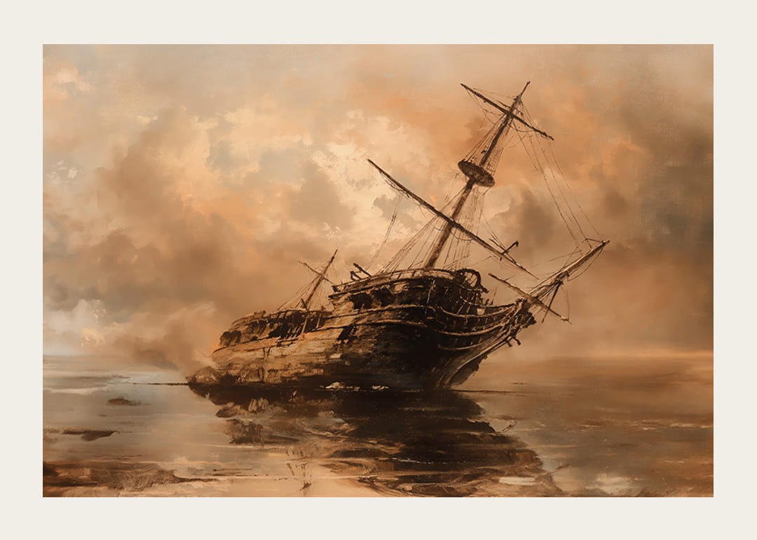 Ez a drámai poszter egy elhagyott hajóroncsot örökít meg a csendes vizekben, köddel és titokzatos égbolttal körülvéve. A tompa, meleg tónusok a kaland, az elveszett kincsek és az idő múlásának érzetét keltik.