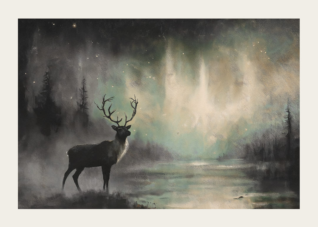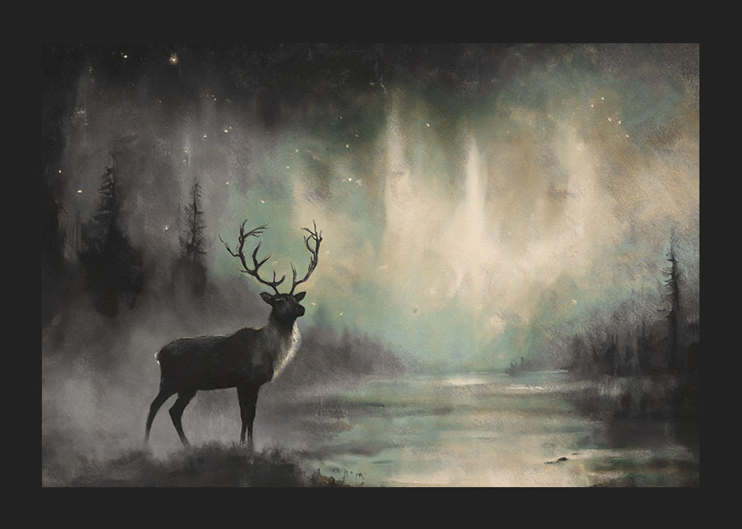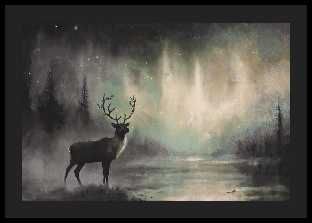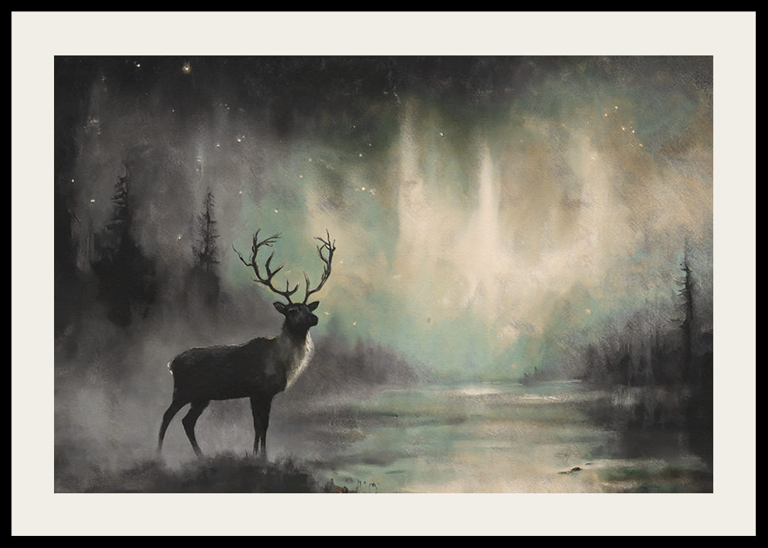 Merüljön el a természet misztériumában ezzel a poszterrel, amely egy fenséges szarvast ábrázol, amint az északi fény varázslatos ragyogása alatt áll. A táncoló fények és a ködös erdei háttér álomszerű légkört teremt, tele csenddel és erővel. Ez a poszter tökéletes a vad szépség és az időtlen elegancia érzésének kölcsönzéséhez otthonában, a természet varázslatának ünnepe.