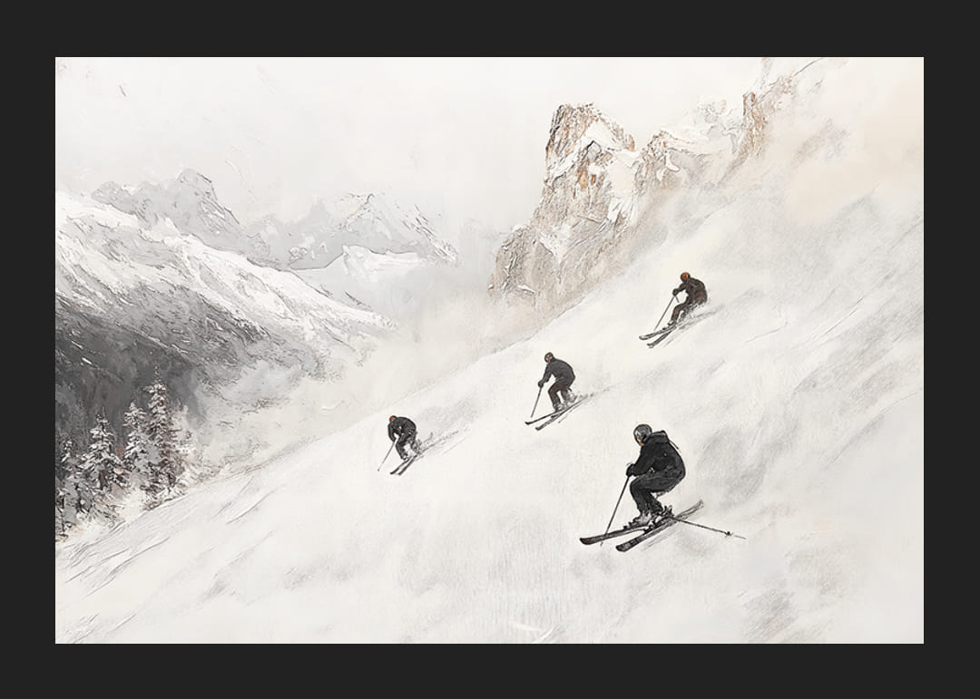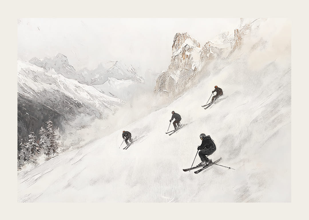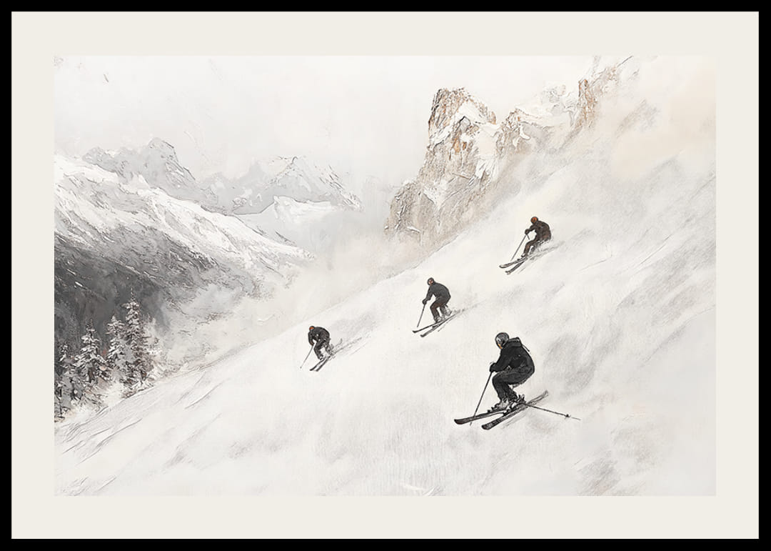 Tapasztalja meg a téli kalandot ezzel a stílusos poszterrel, amely megragadja a szabadság és a sebesség esszenciáját a fenséges Alpokban. Négy síelő söpör le a hóval borított hegyoldalon, drámai csúcsokkal és csillogó fehér hóval körülvéve. Lágy színsémájával és időtlen dizájnjával ez a poszter tökéletes részlet, amellyel nyugalmat és kalandot teremthet otthonában