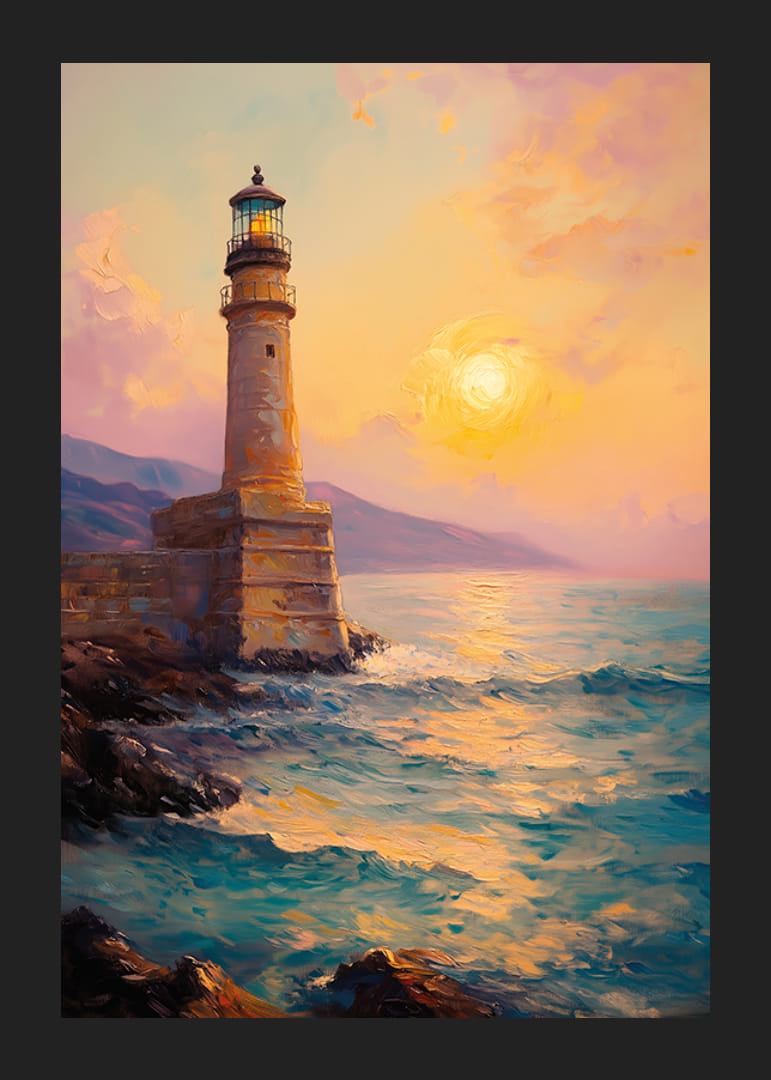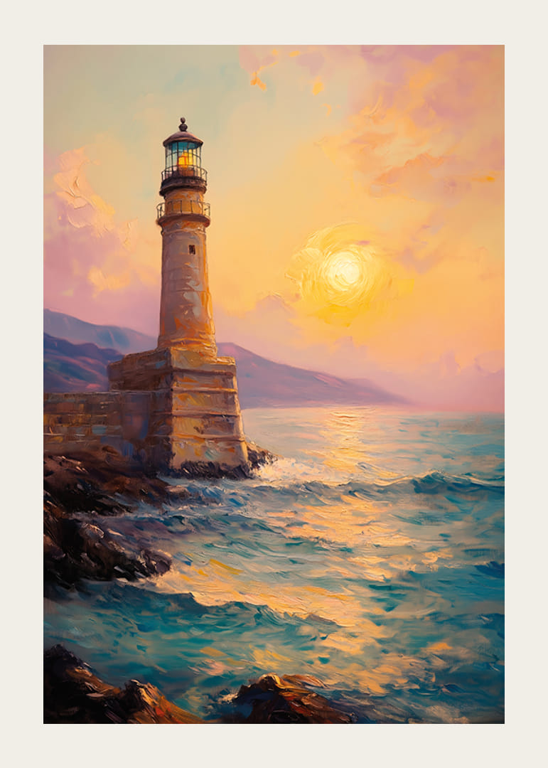 Ez a poszter hangulatos tengerparti kilátást örökít meg, ahol egy impozáns világítótorony világít a nap utolsó sugaraiban. Az arany és a rózsaszín meleg árnyalatai tükröződnek a szikrázó tengerben, ahogy a hullámok a sziklák felé gördülnek.