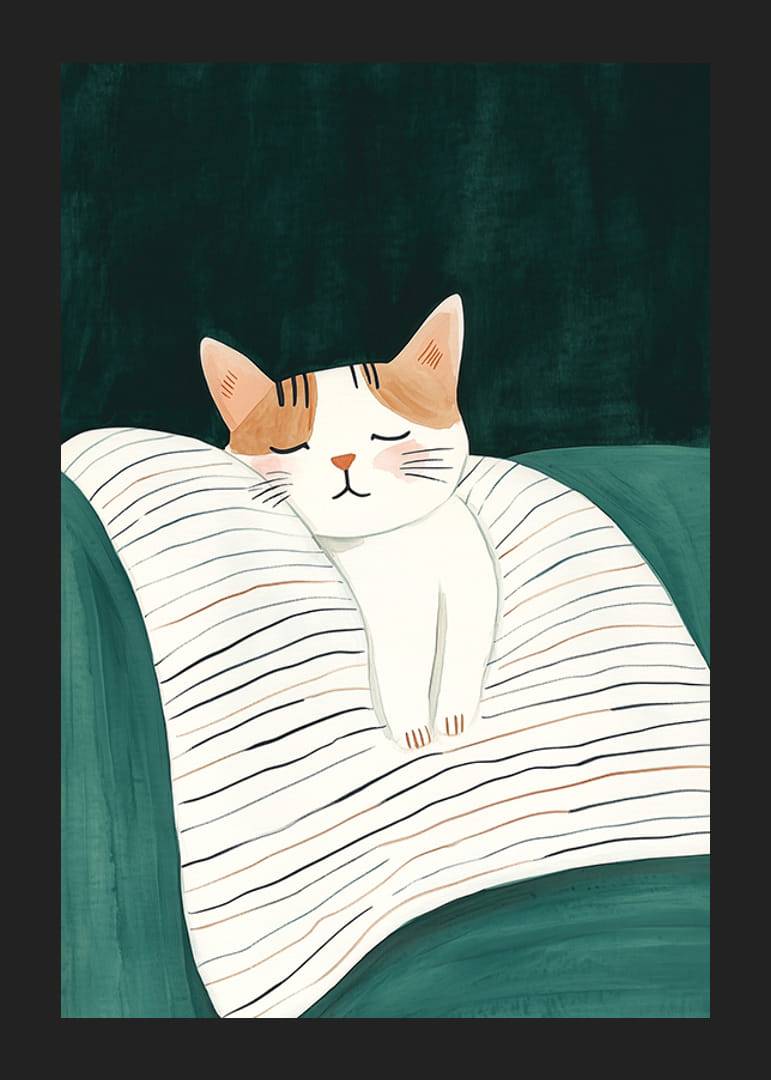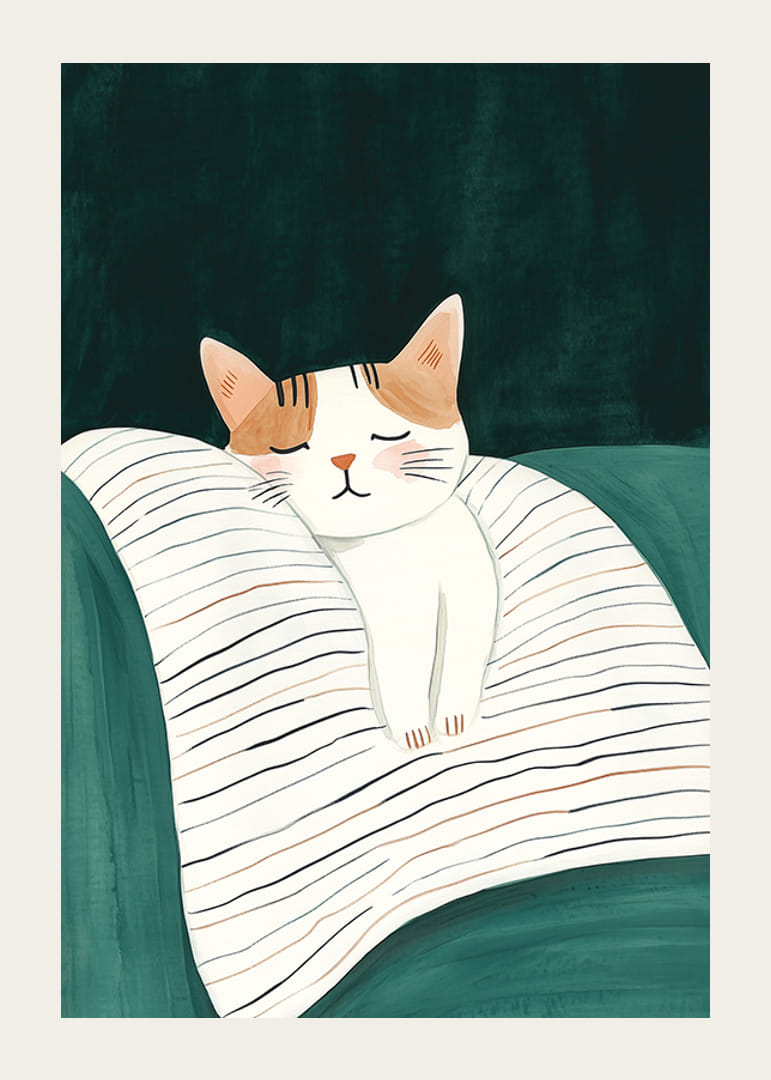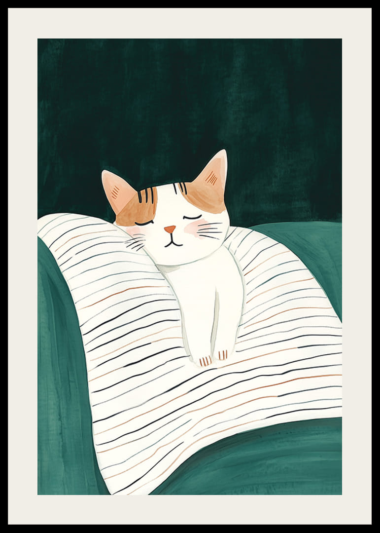 Bájos poszter egy alvó macskával, lágy és játékos stílusban illusztrálva. A macska békésen pihen egy tompa zöld és meleg tónusú csíkos takarón, megnyugtató és otthonos érzést keltve.