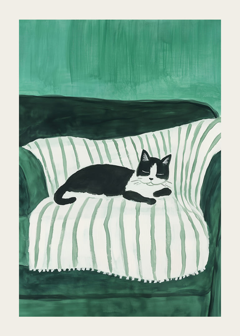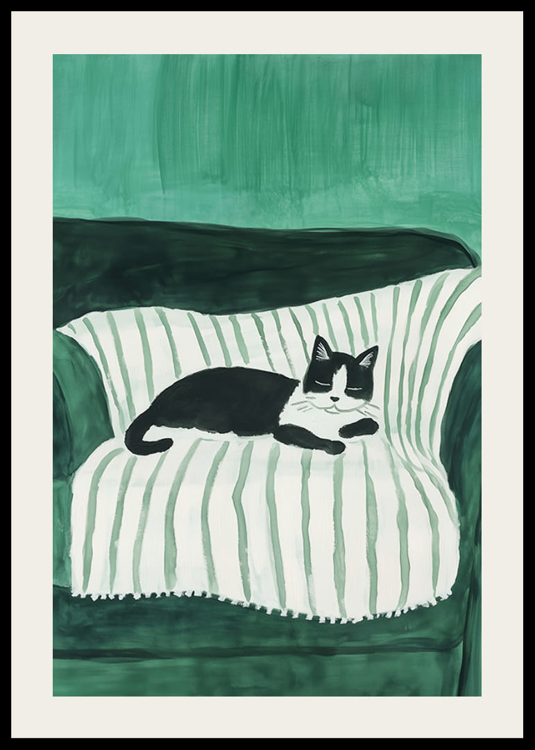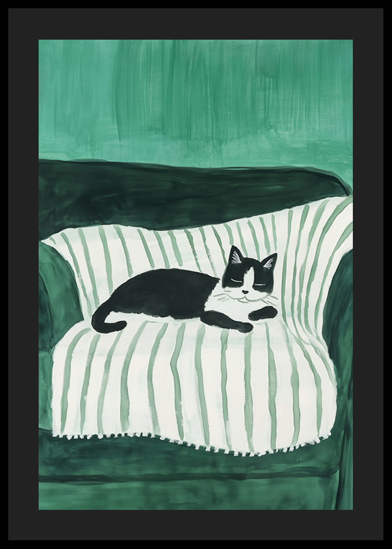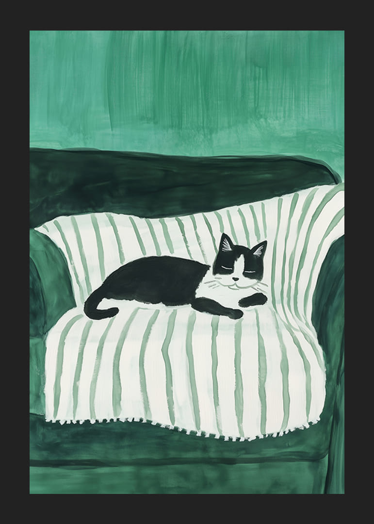 Ez a stílusos poszter egy fekete-fehér macskát ábrázol, amint békésen alszik egy csíkos takarón egy mélyzöld karosszékben. A lágy kontrasztok és a harmonikus színtónusok nyugodt és elegáns légkört teremtenek, tökéletesek ahhoz, hogy otthona modern és otthonos hangulatot varázsoljon.