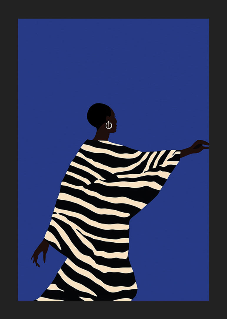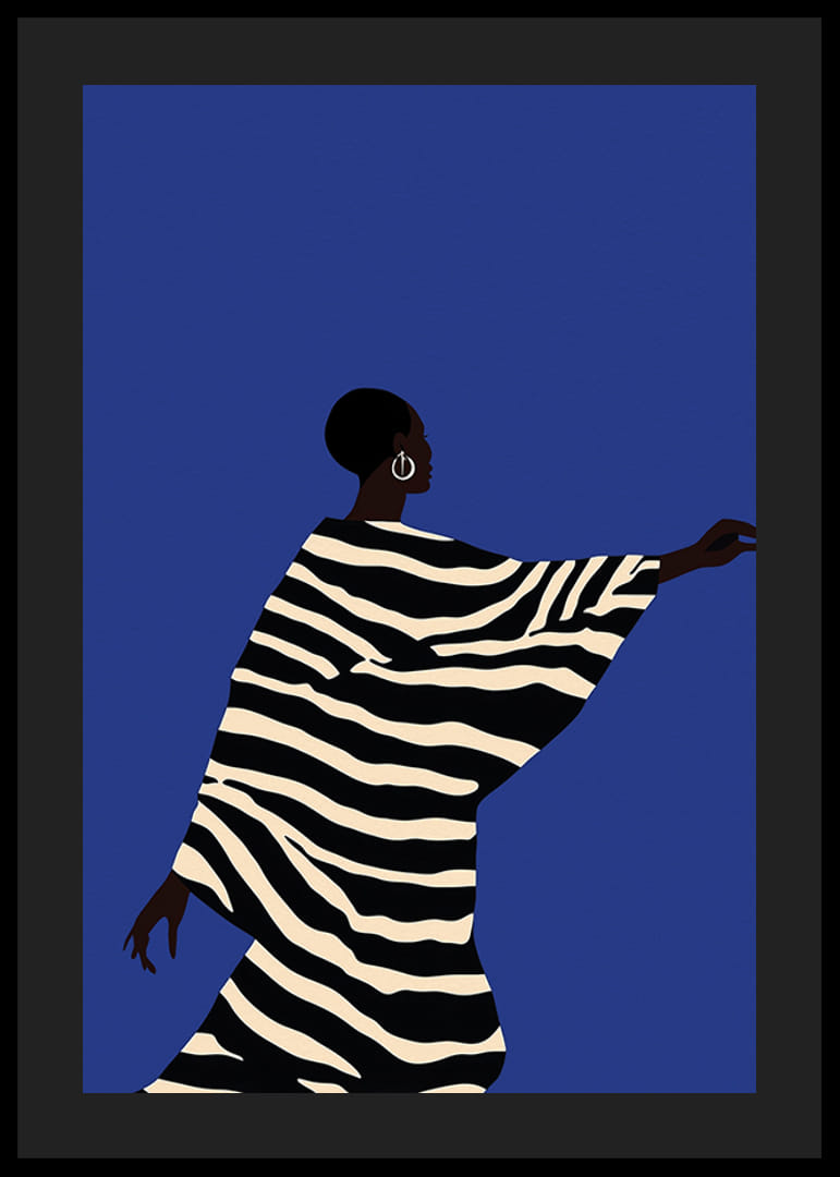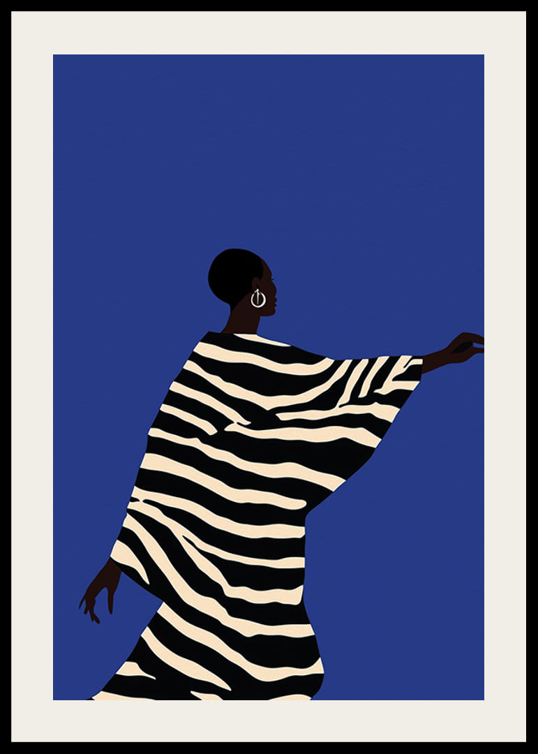 Ez az elegáns poszter egy fekete-fehér csíkos ruhába öltözött elegáns alakot ábrázol mélykék háttér előtt. A lágy vonalak és az erős színkontrasztok modern és kifinomult érzést keltenek.