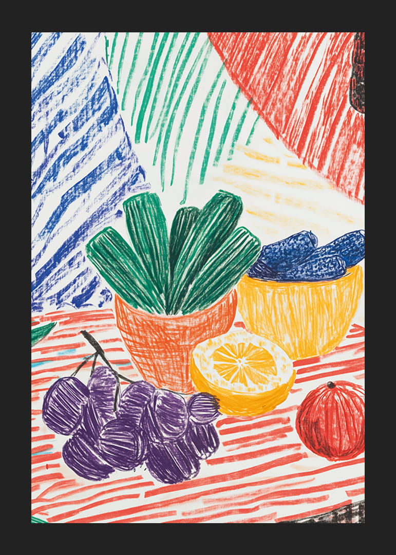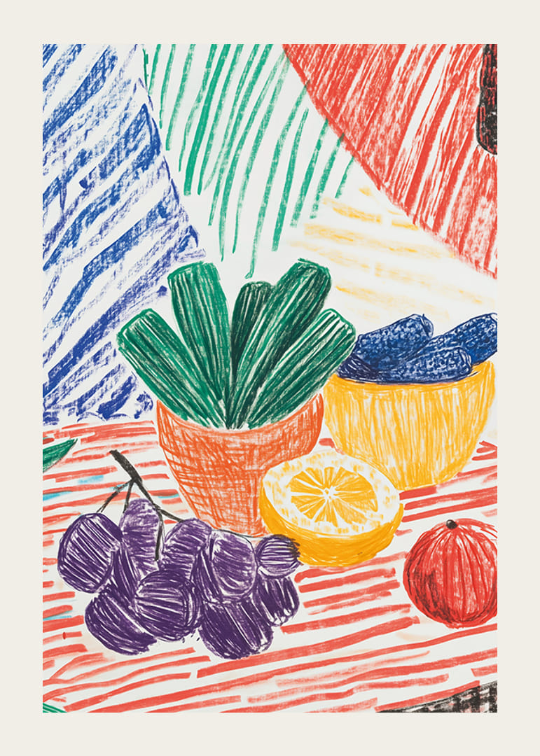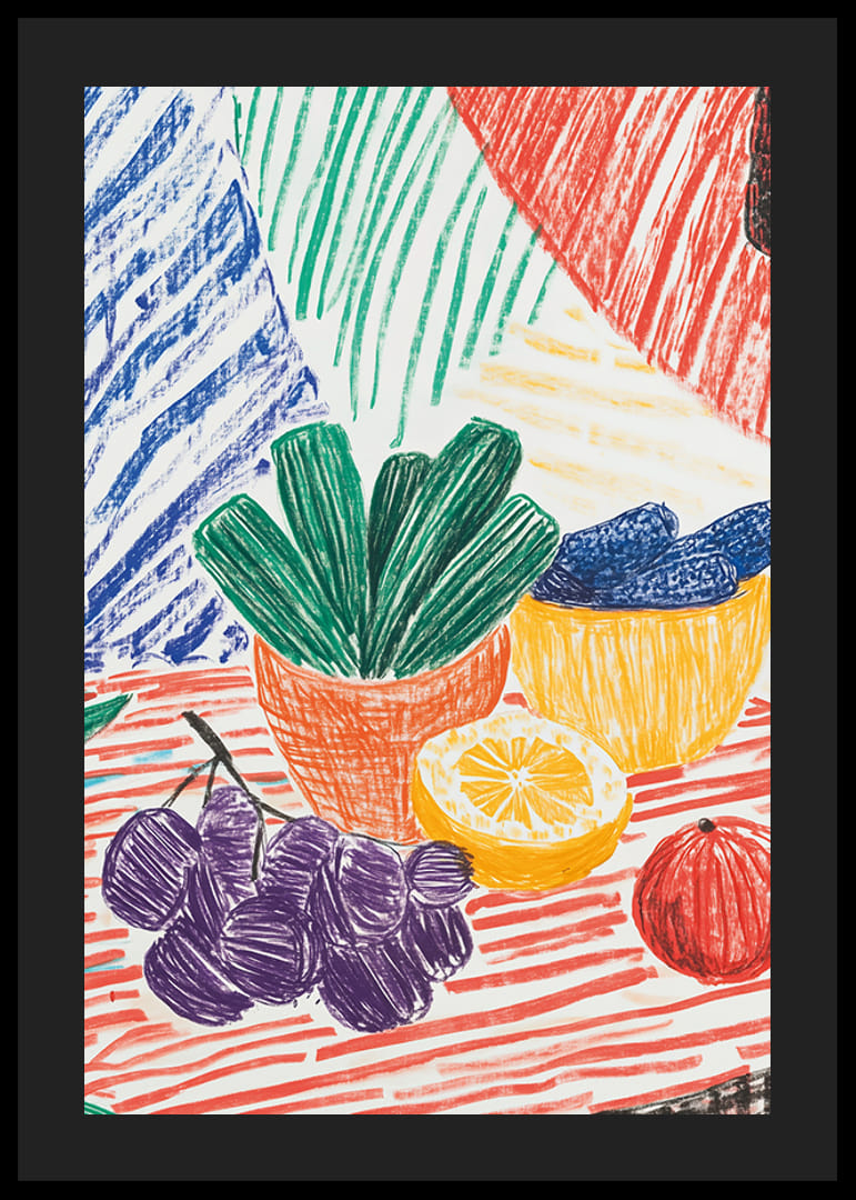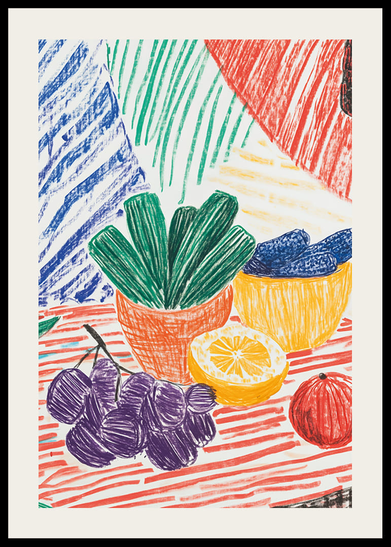 Ez az élénk és színes poszter egy játékos csendéletet ábrázol gyümölcsökkel és növényekkel a vörös, zöld, sárga és lila erős árnyalataiban. A merész vonalak és a kézzel rajzolt érzés bájos és nyugodt stílust kölcsönöz a műalkotásnak.