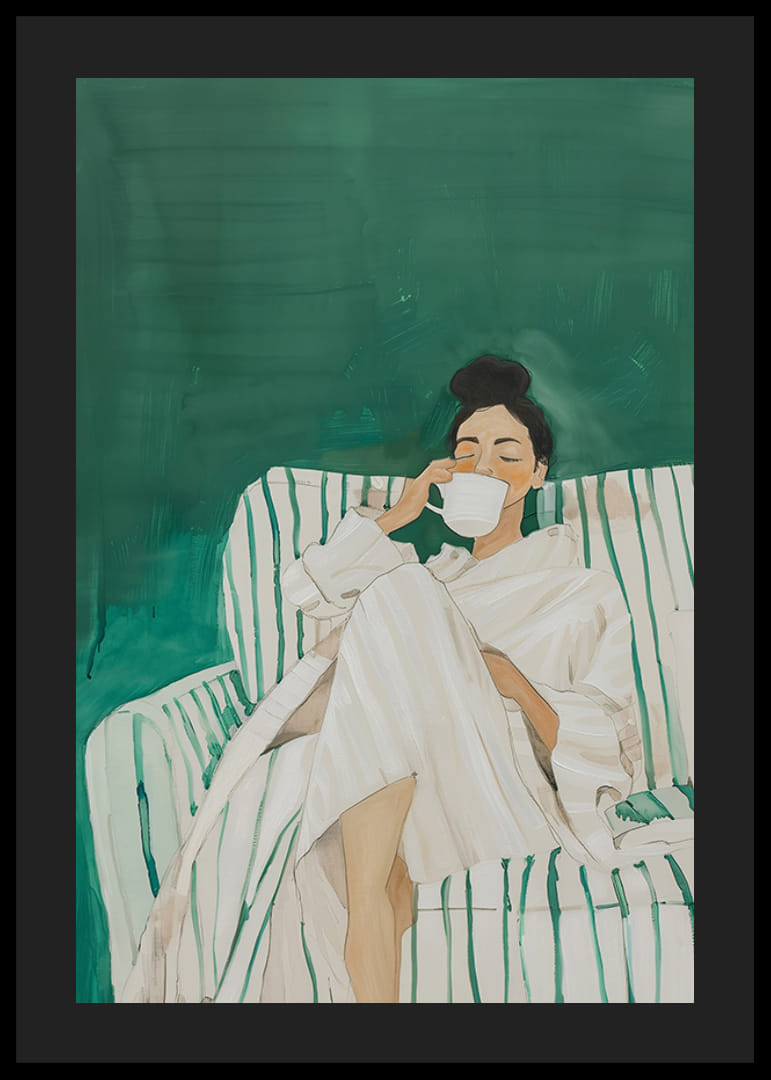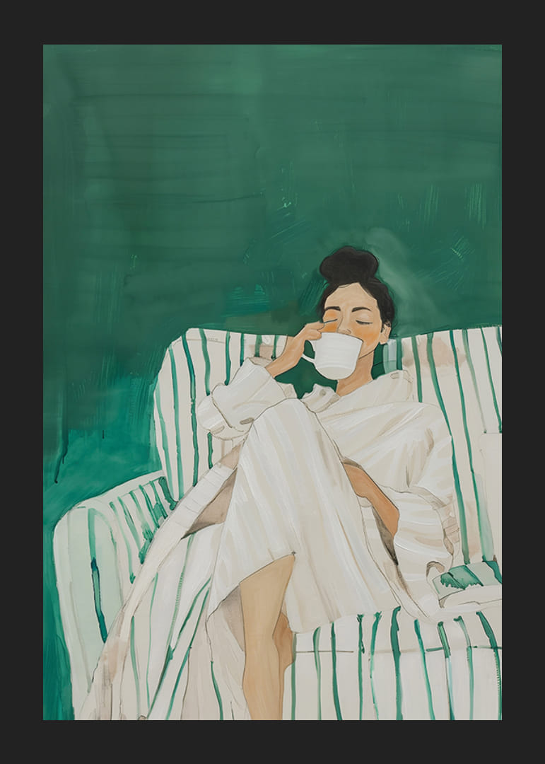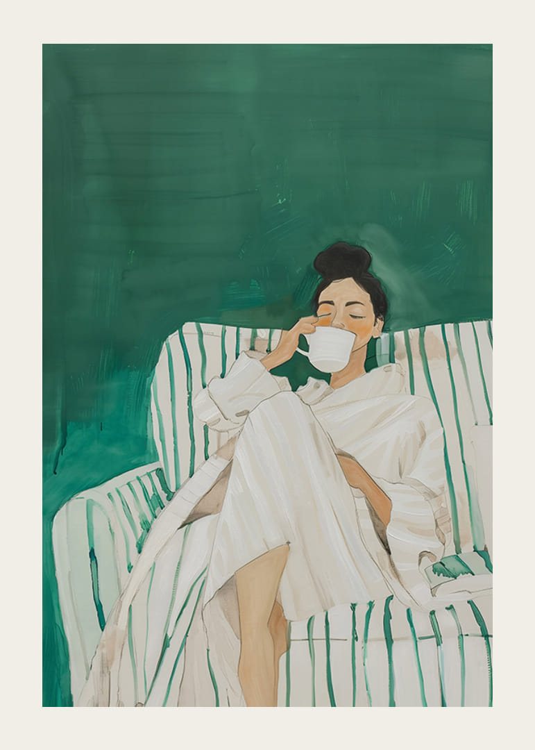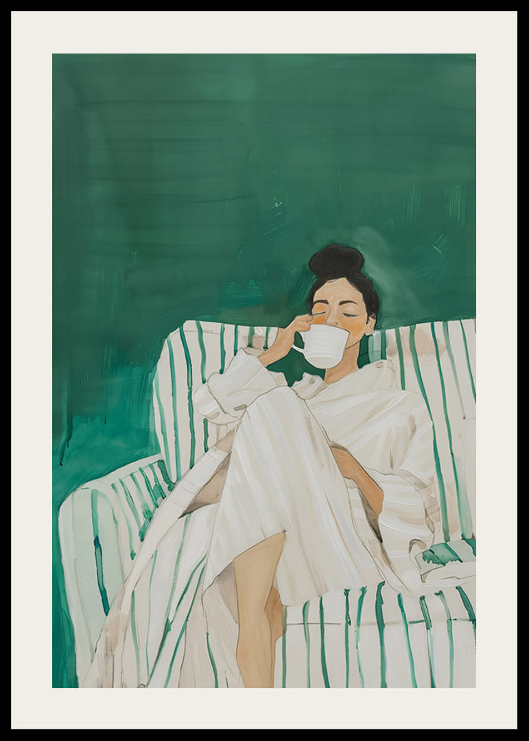 Ez a gyönyörű illusztráció egy békés reggeli pillanatot örökít meg, amikor egy nő elfogyaszt egy csésze meleg teát vagy kávét. Puha fürdőköpenybe burkolva és egy csíkos kanapén pihentetve, tompa zöld tónusok veszik körül, amelyek nyugalmat és egyensúlyt keltenek.