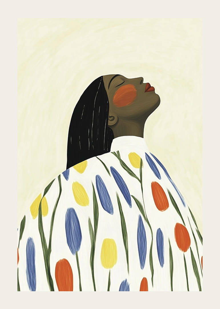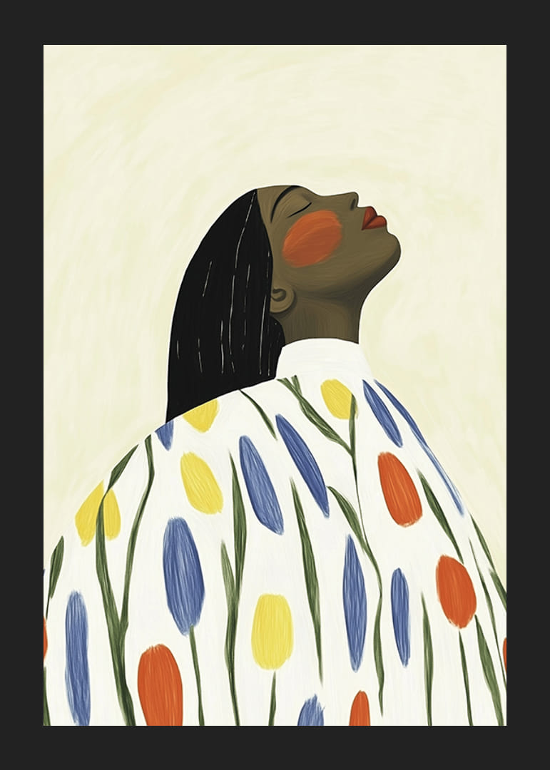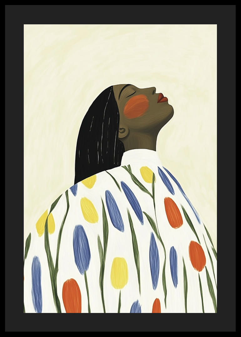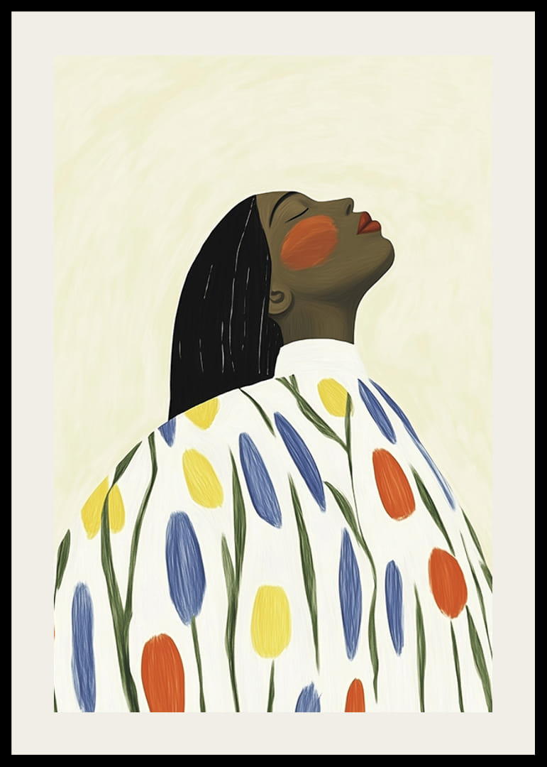 Merüljön el ebben a lenyűgöző plakátban, ahol az erő és a szépség találkozik. A csukott szemű profil békét és figyelmes jelenlétet fejez ki, míg a meleg, élénk színekkel teli virágos kabát a természet erejét árasztja.