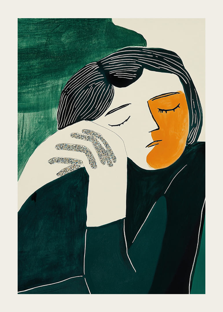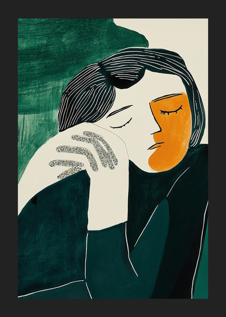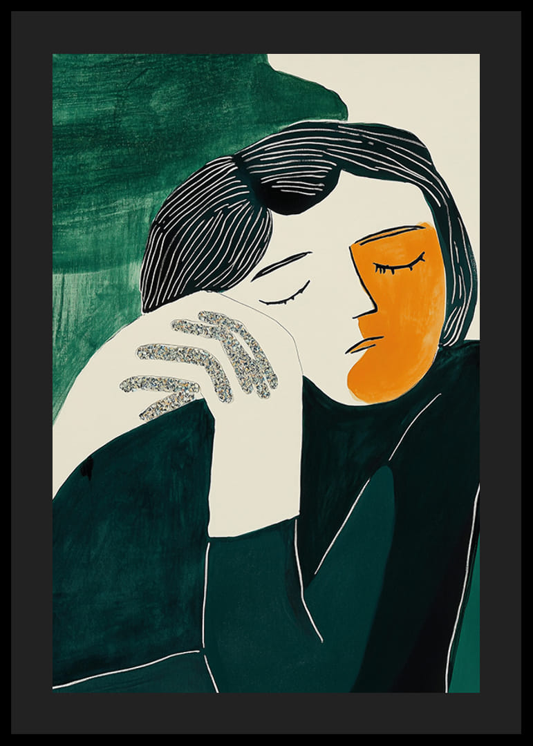 Merüljön el ebben a lenyűgöző képben, amely megragadja a pihenés és az önvizsgálat érzetét. Mély, zöld tónusok veszik körül a központi arcot, melynek kifejezése a szemlélődés és a nyugalom harmonikus egyensúlyt teremt.
