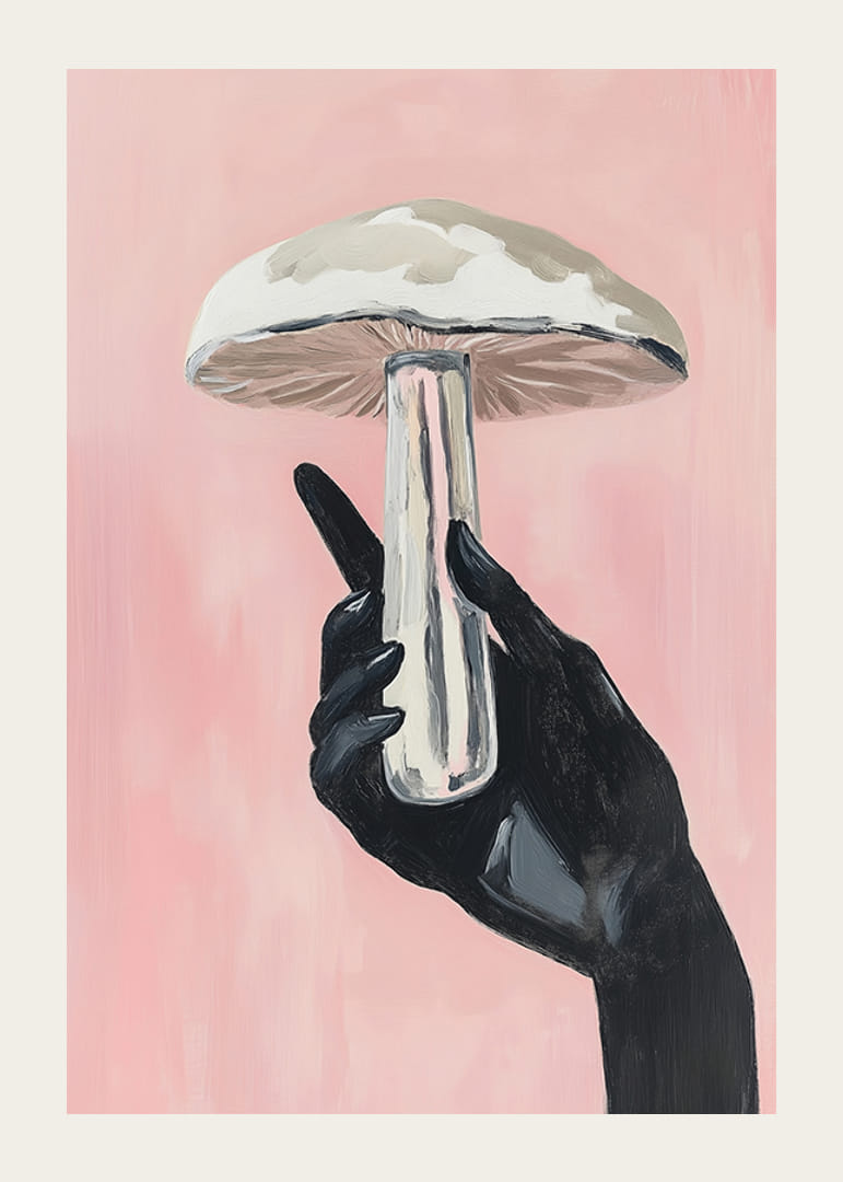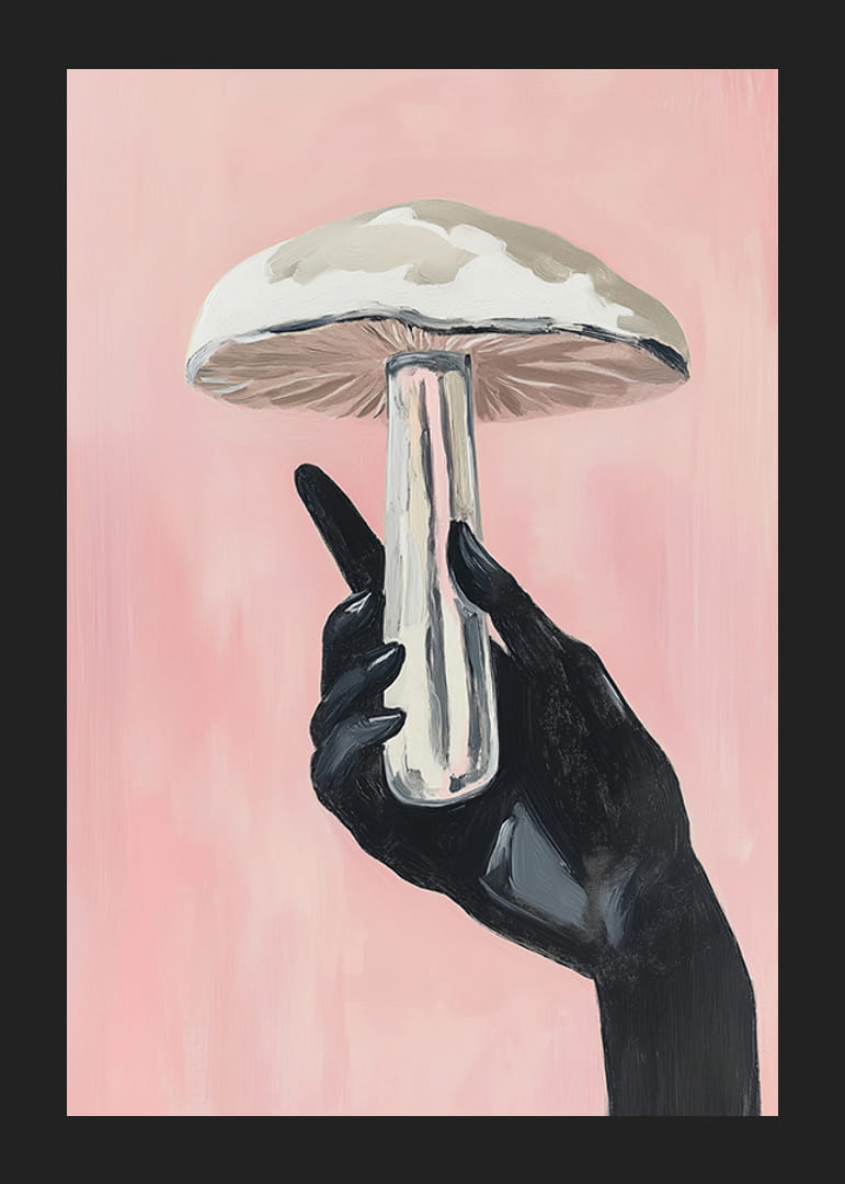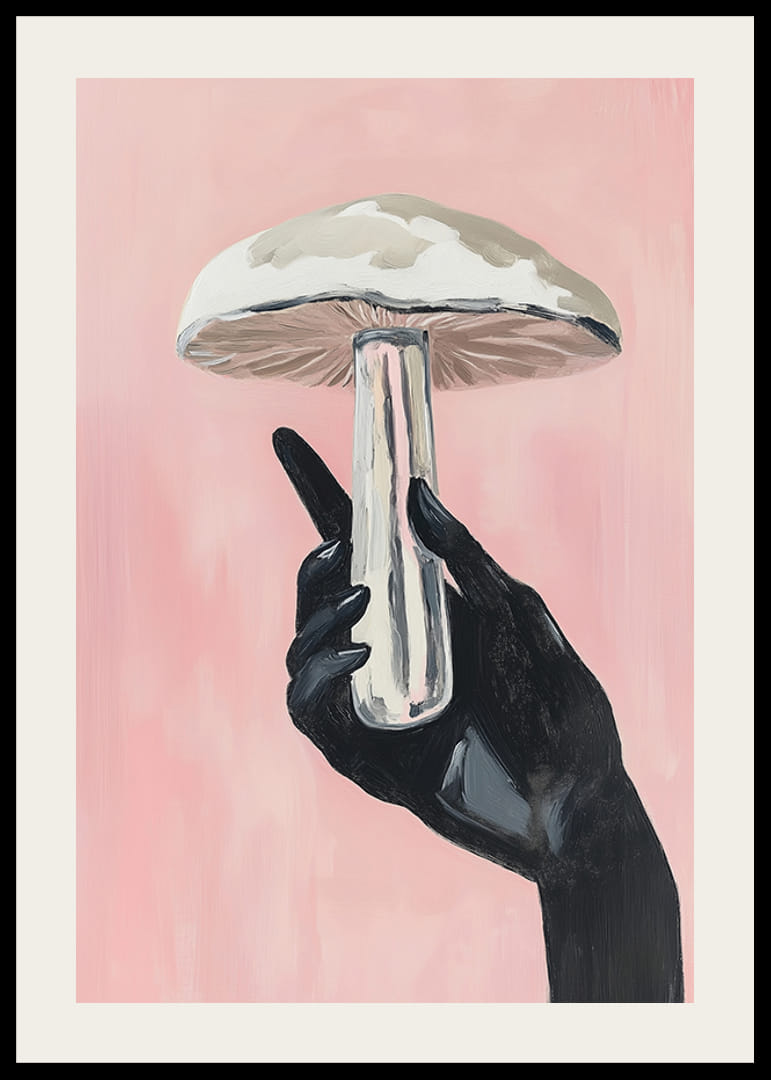 Tapasztalja meg az álomszerű titokzatosság és a modern esztétika ötvözetét ezzel a lenyűgöző plakáttal. Sötét, elegáns kéz gyengéden tart egy impozáns gombát a lágy rózsaszín háttér előtt, finom kontrasztot hozva létre, amely művészi finomsággal hatja át a helyiséget.